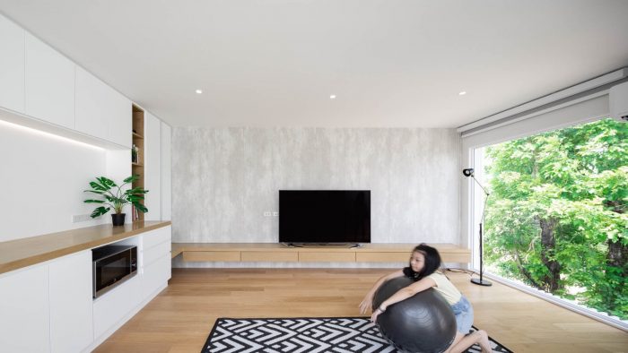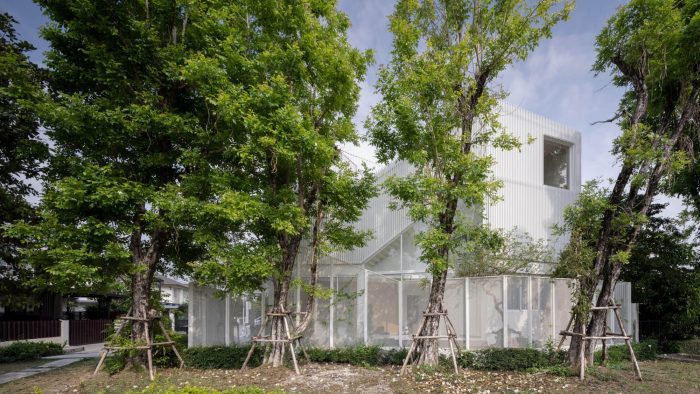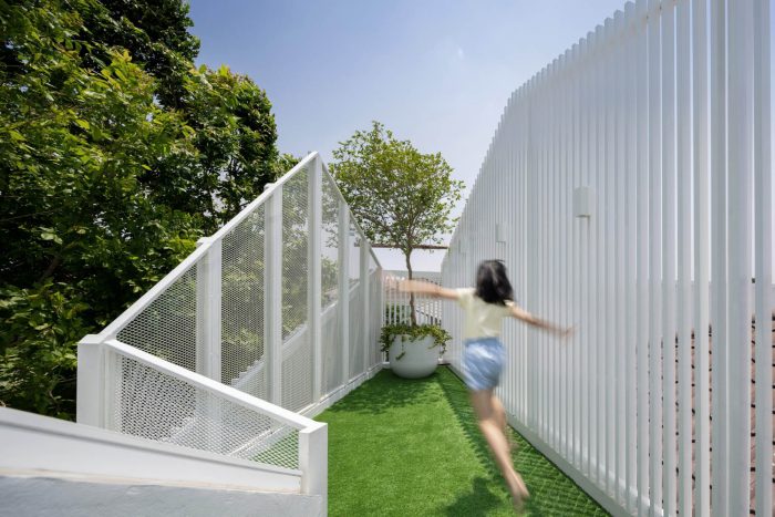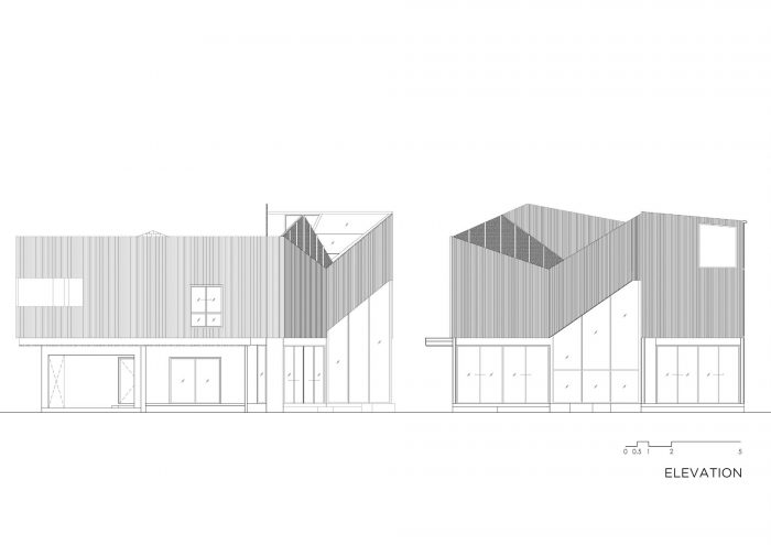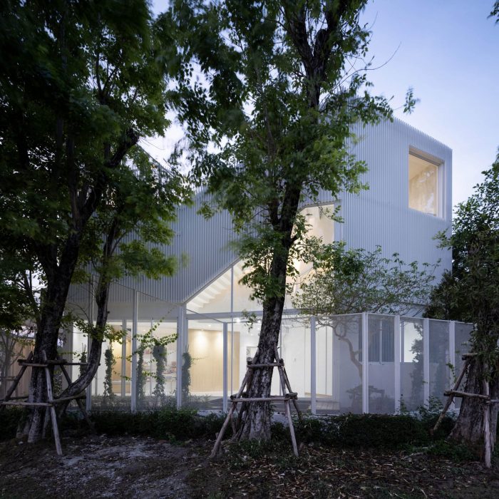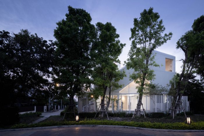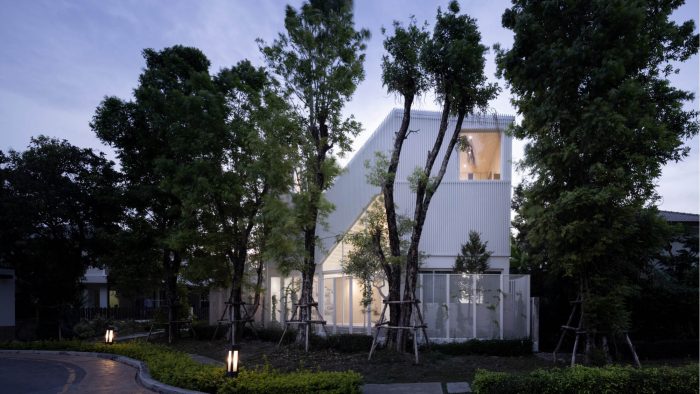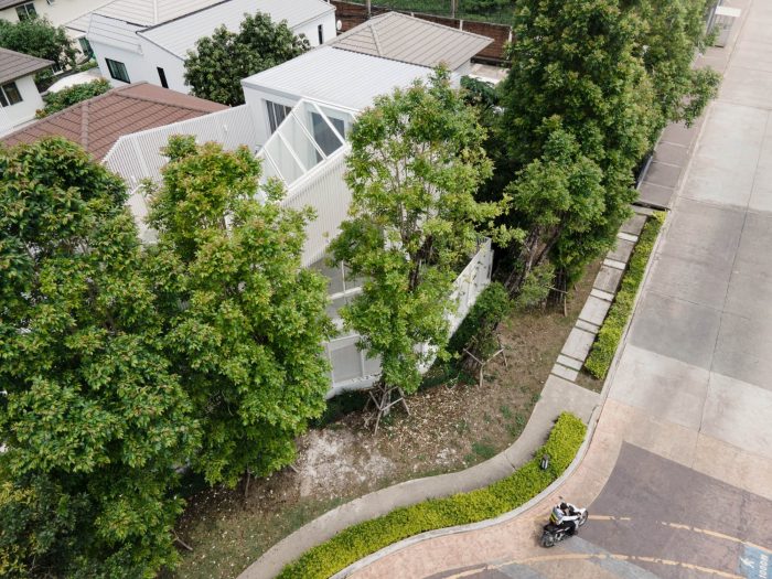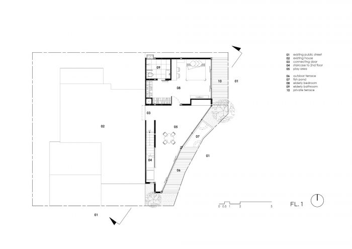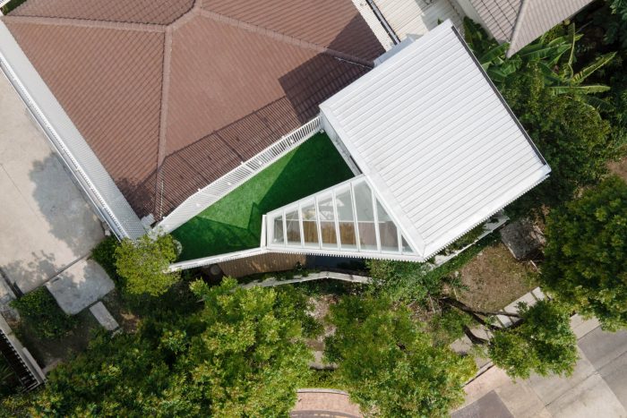 Three-floor is created to combine all functions needed, which are; an activity space connects to an existing house and outdoor terrace with one bedroom for elderly on the first floor, master bedroom on the second floor, and living area on the top floor. Since an existing garden is replaced by the building, it is elevated to the top floor instead, to remain green area with increasing indoor used space of the house.