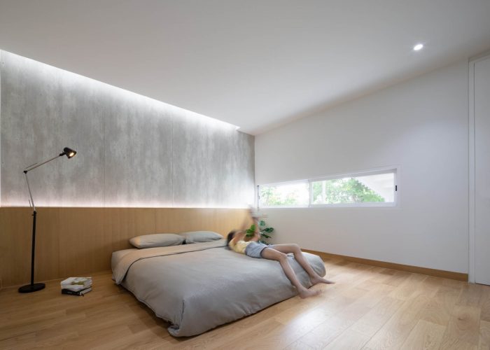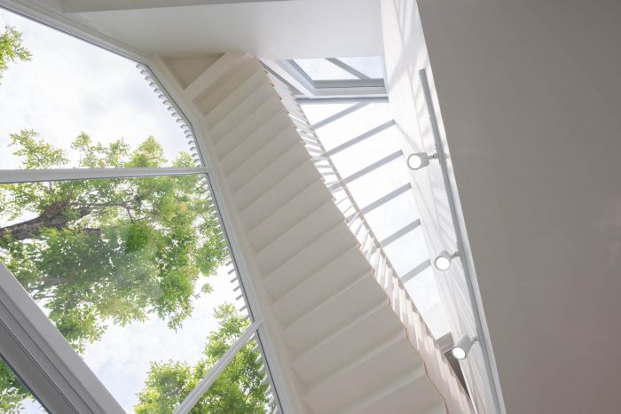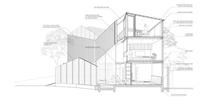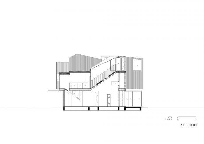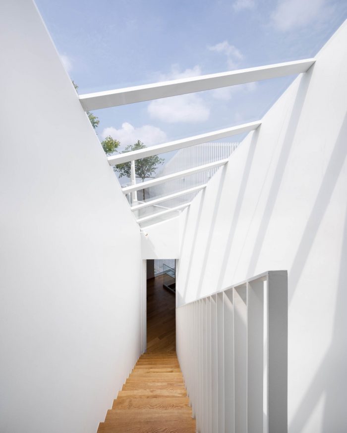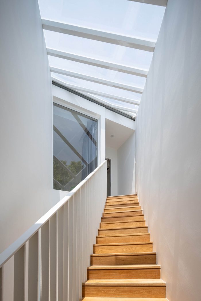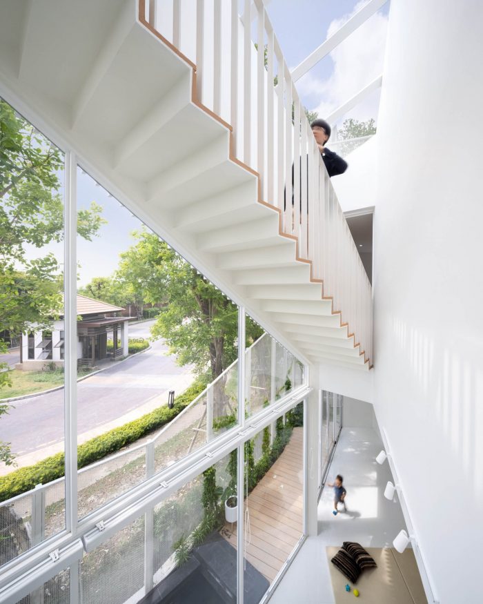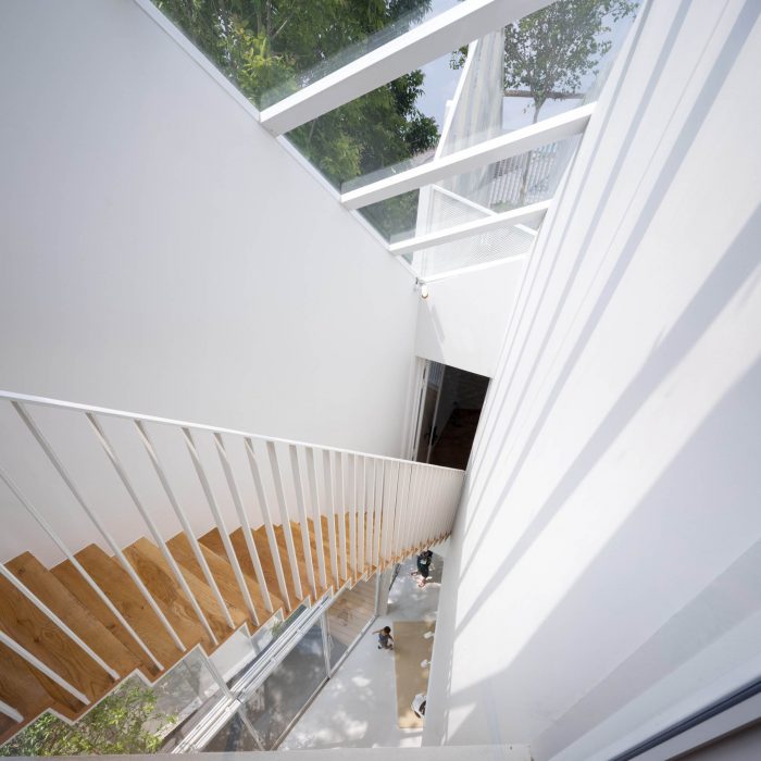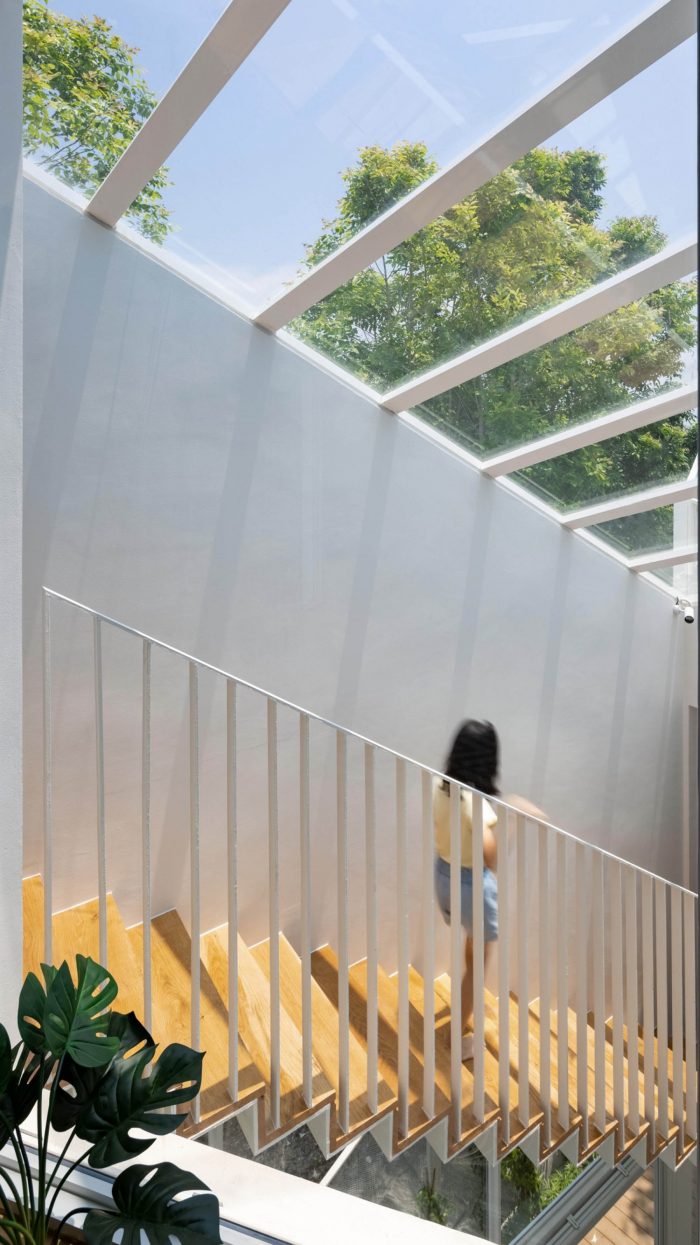 Steel structure is applied, mainly for reducing beams’ depth which affects total building height, yet it helps decreasing column size which increasing more interior space. Two staircases are placed in different corner which minimize circulation. Double space in between the stairs with skylight allows natural sunlight through downstairs, instead of creating vertical voids with lacks privacy.