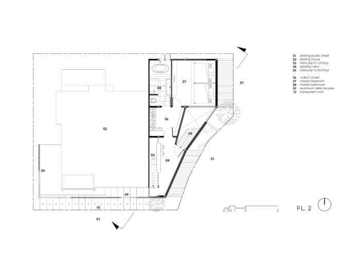 不仅是小的曲线三角形的土地形状,而且还位于连接公共街道两侧的角落。扩建的形状类似于一个海湾,与土地的曲线平行,以充分使用空间的潜力。