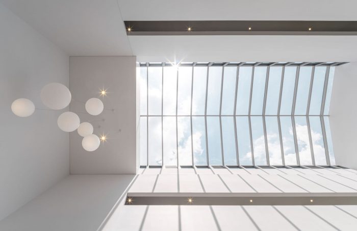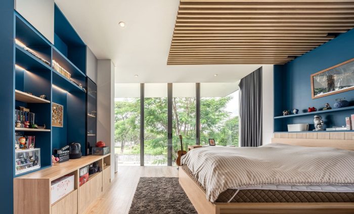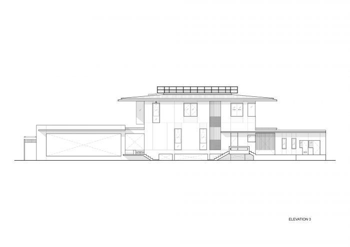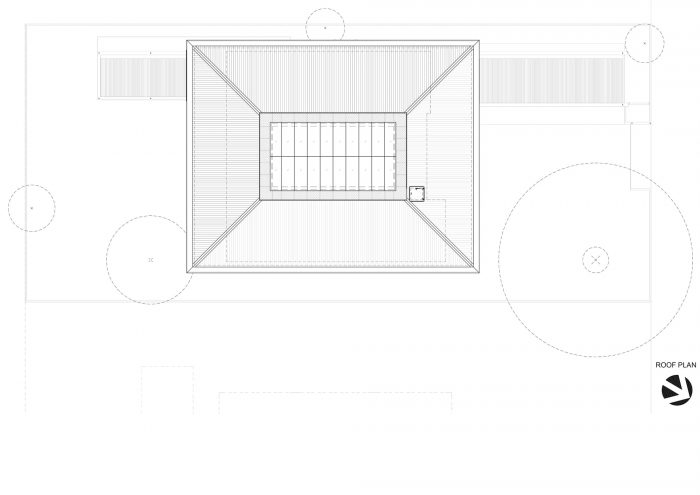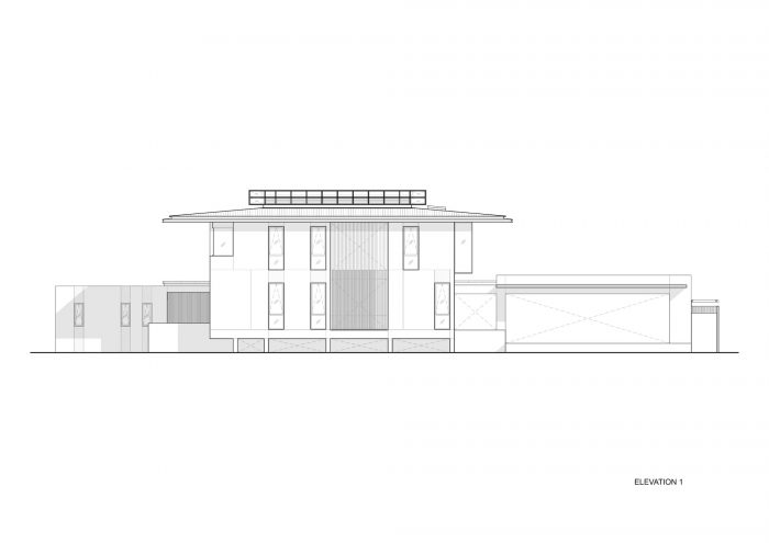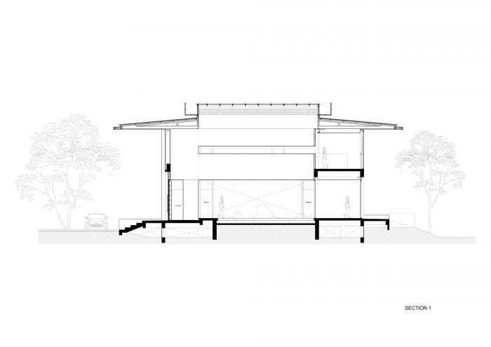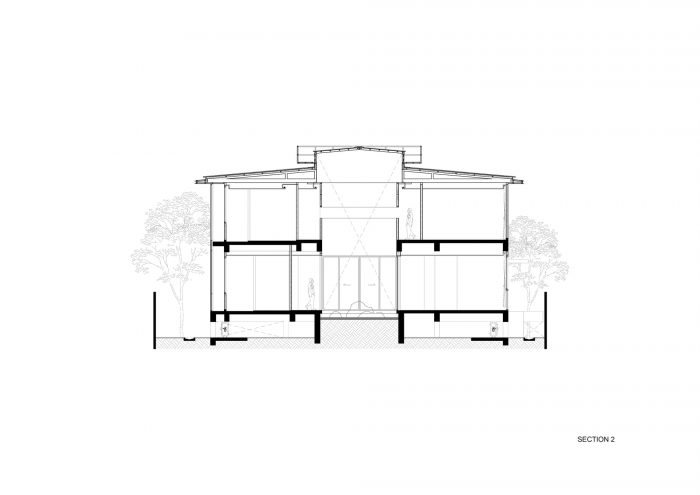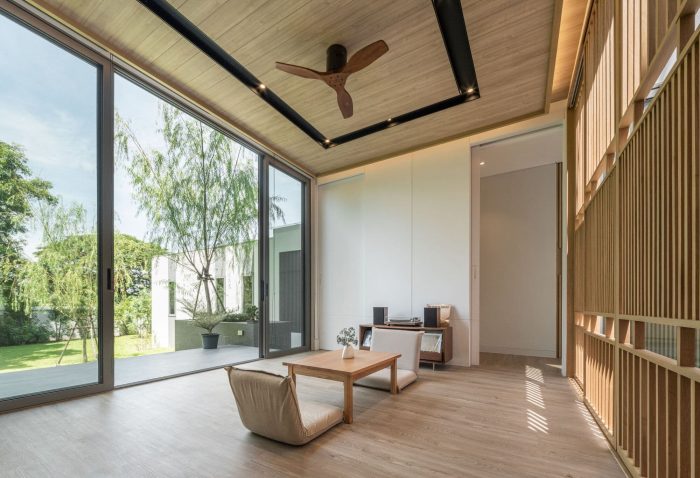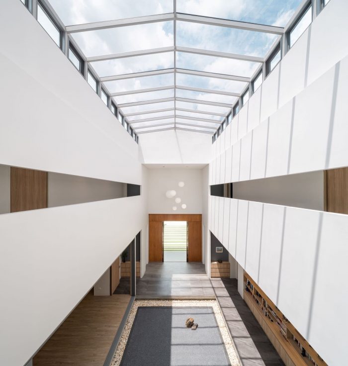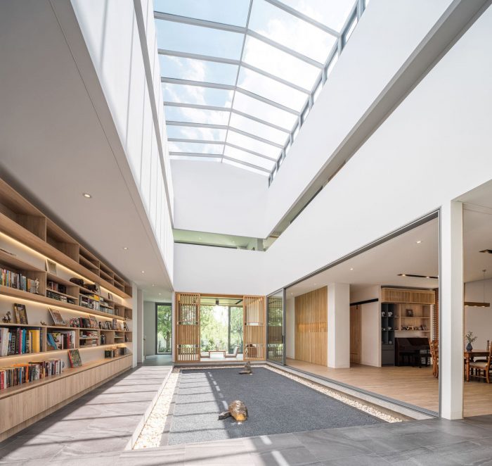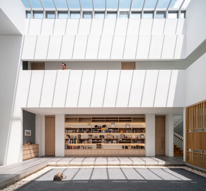 We then created a closed stone courtyard with a large skylight the same size as the courtyard because we wanted to have the sunlight come in and create shade and shadow on the pebble stones the same as in the temple. We also create a chimney effect by lifting the skylight up with clerestory windows that can be operated manually via a roof hatch and catwalk around to open and close the windows to control smell and noise. These also let the hot air out and enhance natural ventilation from below. We try to have as many doors as possible and windows on the North and the South to create cross ventilation to avoid heat traps inside the house. When the house doors and windows open, you will feel the natural breeze through the house, so we don’t need air conditioning in the space. We also have a secret window behind aluminum slats that can be opened all day and night for safety.