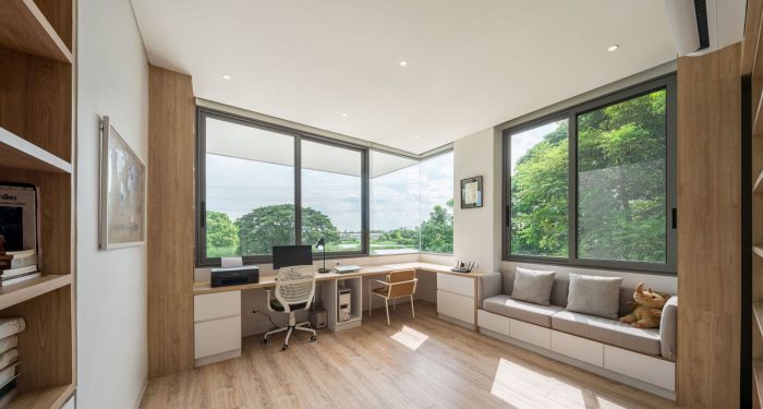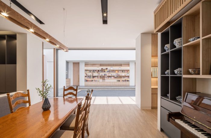 The house is mostly white with natural wood color to represent simplicity and calmness. The courtyard now connects the long bookshelf along the corridor and the living and dining room. The small stone courtyard (4x6m) is now larger than it is as it is a part of the living area.