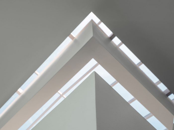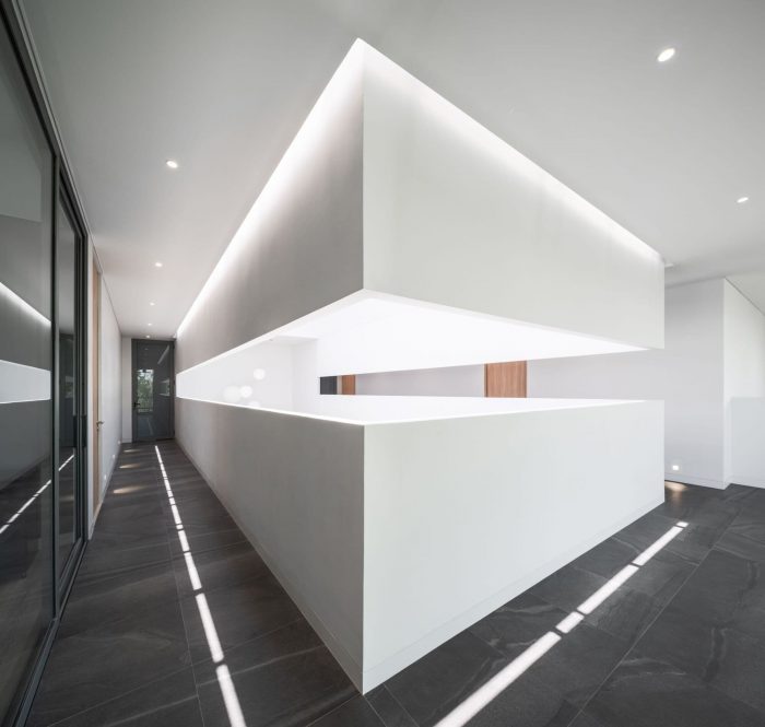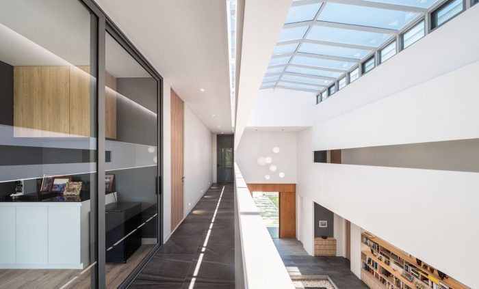 We also simulated the shadow direction from the skylight and minimize the frame to create clean shadow lines in the direction we want on those walls. The shadow will move throughout the day from one side to the other. The wall on the upper level around the courtyard was held off from the ceiling allowing a small gap to let heat in the corridor escape and bring the natural light inside the corridor, so no need to turn on the artificial light in the daytime. This gap also creates a Japanese paper lantern-like effect floating inside the space. The corridor wall with a small linear small cut out is to providing privacy for the bedrooms and accentuates the courtyard below.