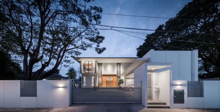 The house is a 5-bedroom house with a GFA of about 650 sqm. located in a private alley, so the environment around is very safe and calm. The Design brief from the owner was a reference image of a Japanese stone courtyard at Ryoanji Temple in Japan. The owner wanted to have a similar kind of stone court in the house. There were also site issues from the noise from a few Mosques around the area, and the bad smell from a dumpsite when it rains. Typically, in our tropical climate, we try to avoid an enclosed courtyard due to the strong sunlight and heat. This house was an exception we made a different design approach. We made it outside-in. We brought the stone court inside the control environment from noise and smell and deal with the rest.