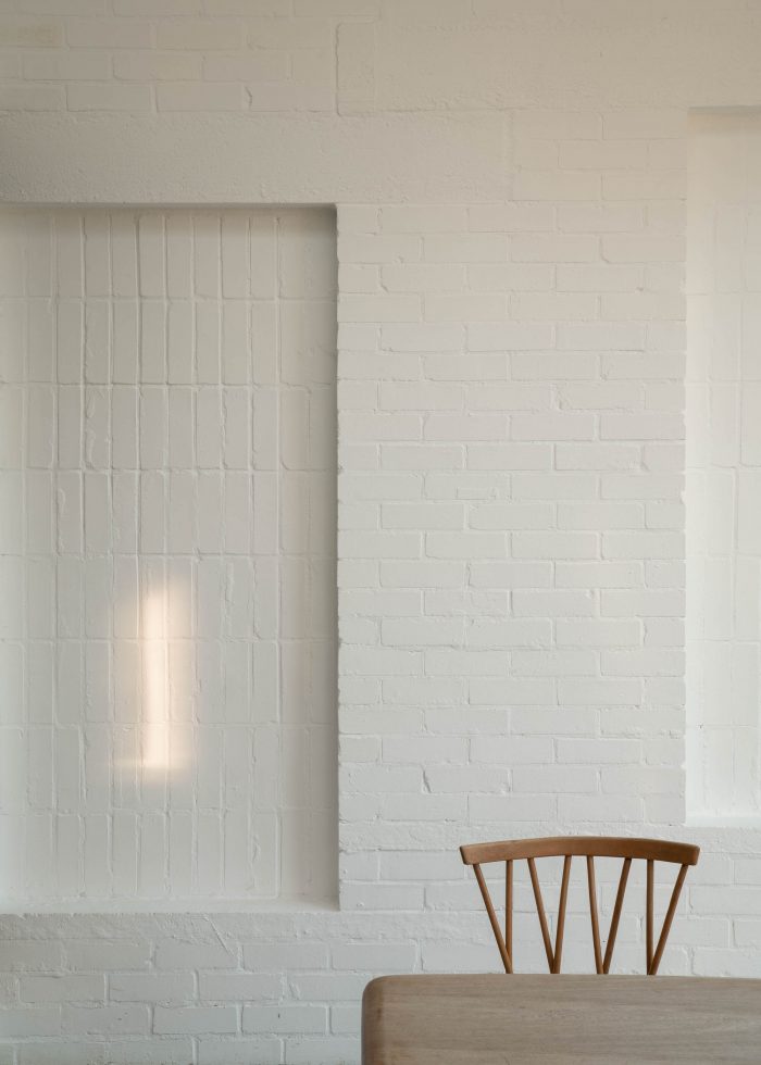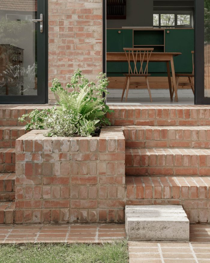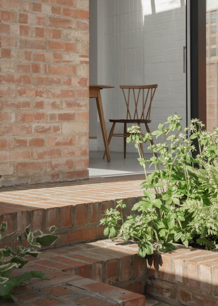 The extension’s massing is lifted to the west to create a volumetrically generous dining space with a tall sliding glazed door and roof light. Beyond this threshold, a brick terrace forms broad steps, flanked by planters, where family and guests can rest, enjoy the garden, and eat at the lower patio’s freestanding table area. With an unbroken route running from the front of the house through to the garden beyond, the western party wall remains host to the home’s principal living activities.