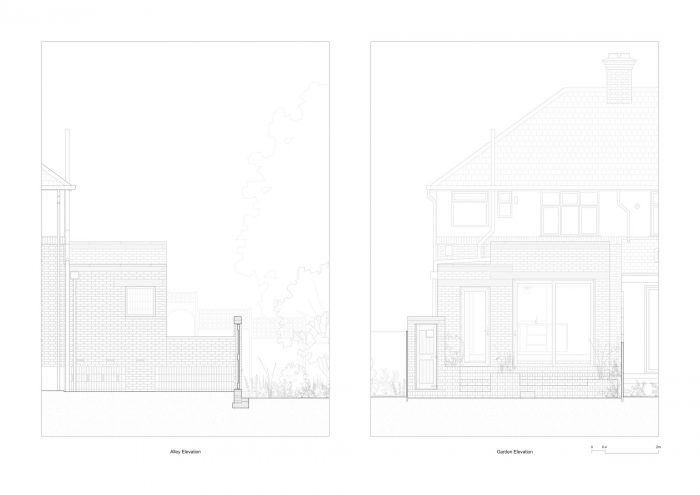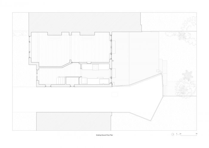 该方案。 该住宅的原始底层平面图采用了明确的分区策略,将较大的生活空间沿西侧的党墙布置;而次要的、辅助的和循环的空间则位于东侧。这种关系决定了前后立面的开口尺寸,入口门进入较窄的次要区域,而凸窗和宽大的天井门则为较大的生活空间服务。认识到这一既定模式,该方案在扩建部分的体量和门窗层次中统一了重新设计的底层平面,并提供了大量重新设计的花园景观设计。