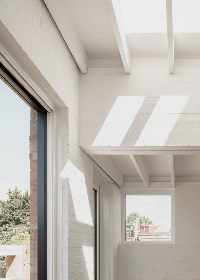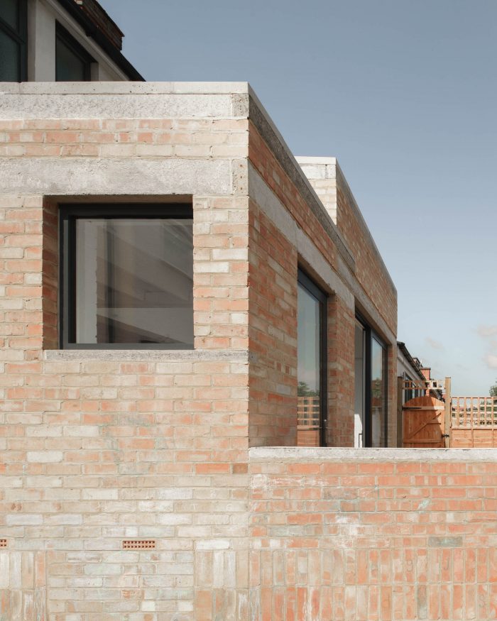 Given the financial constraints of the project, an economy of means was developed using standardised building components throughout. These were purposely utilised, with the broadest off-the-shelf lintel spans selected to maximise both the volume of the extension and the scale of the rear opening to the garden. Fletton bricks are used to build both internal and external walls, while flush, stacked concrete lintels and copings are left exposed throughout. Notched timber joists and a plywood deck complete the stepped soffit of the scheme internally.
