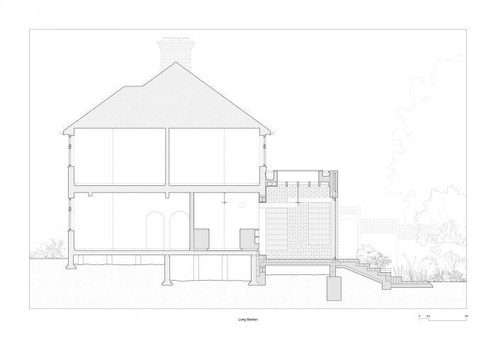 The extension drops in height to the east, much as the hip does at roof level, and responds to the neighbouring properties. The change in height is expressed internally where lintels span from the front to the back of the extension in alignment with the ground floor’s remaining partitions and the home’s traditional spatial pattern. A new glazed door provides regular swift access to the garden, with steeper stairs dropping down to this level. A brick and lintel-built garden gateway and wall form the third mass in this stacking of masonry forms toward the garden.