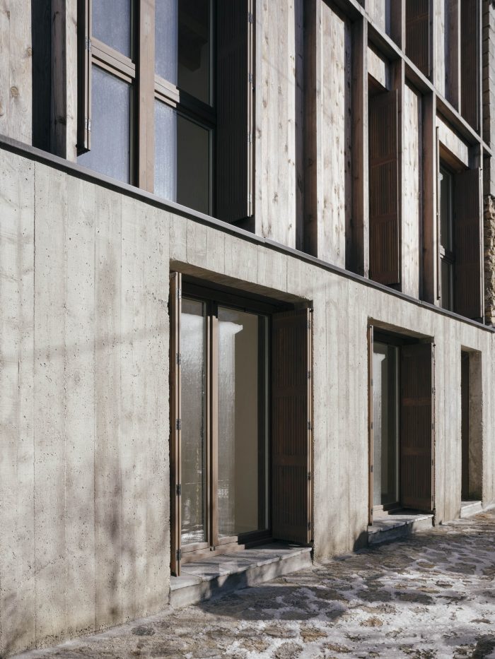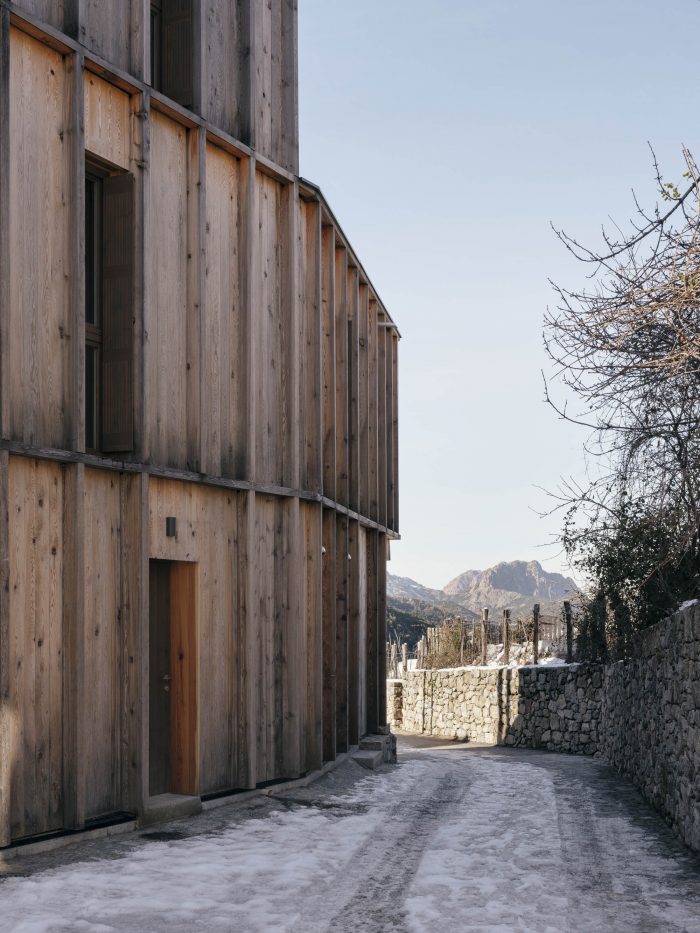 The project is characterised by a structure and a surface mainly wooden-made, thus really setting the building in our times. There was also the purpose of further integrating the modern volumes and shape, considering the material unity and sobriety of the façades. Furthermore, the architecture of the building allows us to create wide openings, necessary to meet the environmental standards as well as framing the views on the mountains afar.