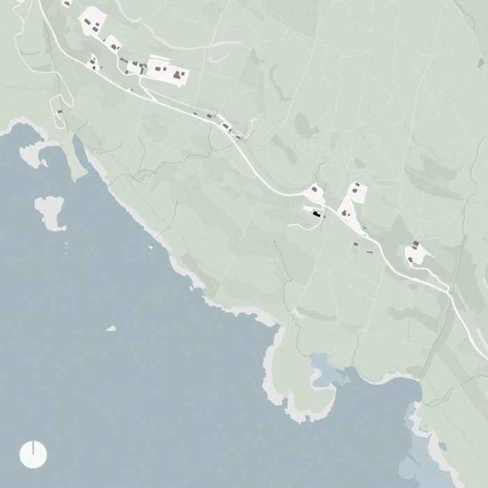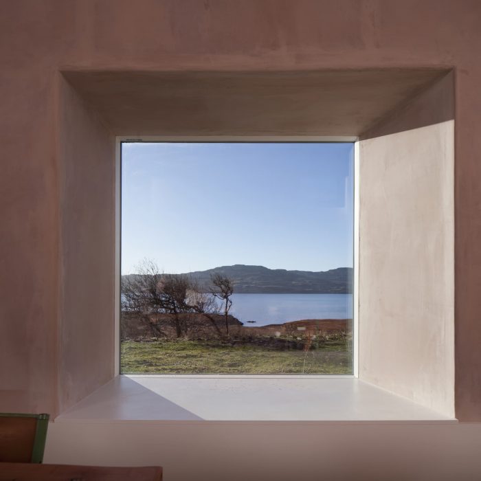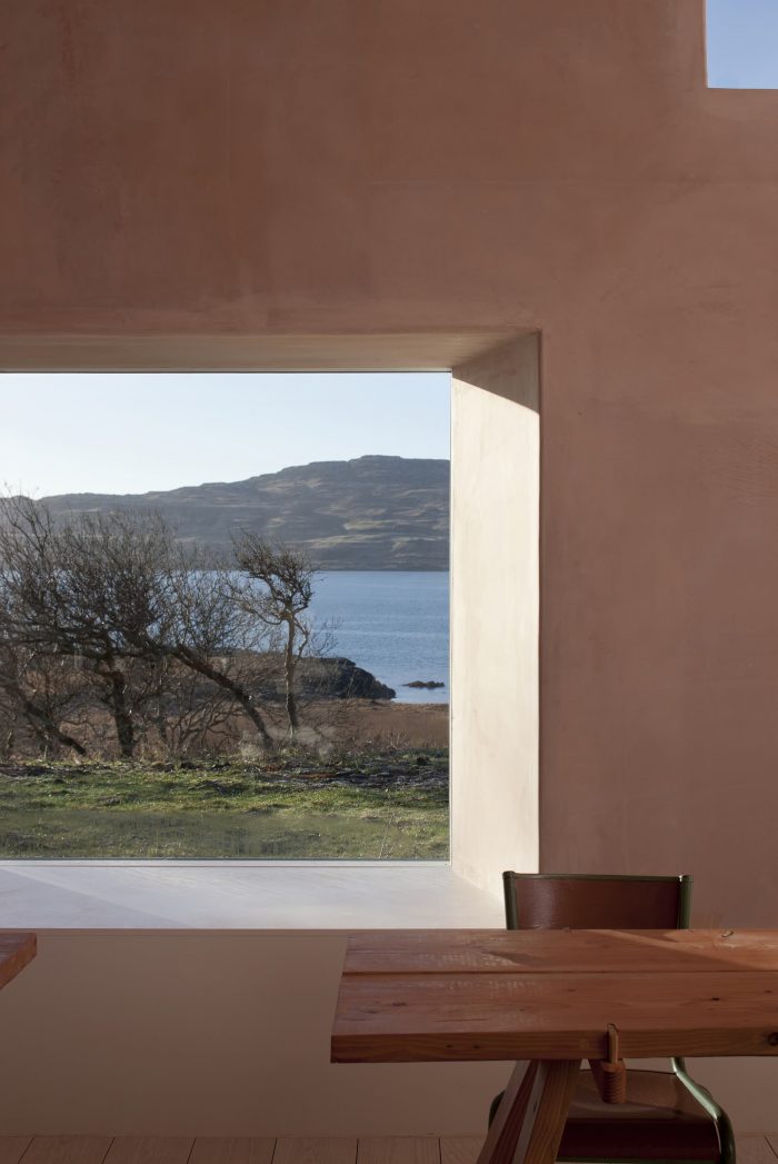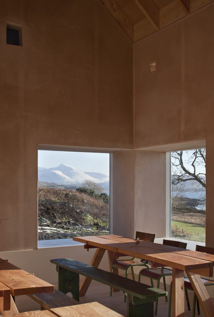 Visitors approach the restaurant from the road above and behind, the long black roofs of the building appearing lower than the sea and Ulva beyond. Descending to the entrance, the landscape becomes hidden from view as the building is accessed via a low, intimate foyer. From there one turns into a tall, light hallway, before turning again, through a deeply compressed doorway and into a grand dining room with spectacular views of the sea, bay, and islands beyond. This sequence of approach and entry is designed to heighten the sense of space and connection to the landscape beyond by first disassociating visitors from the scale and grandeur of the setting.