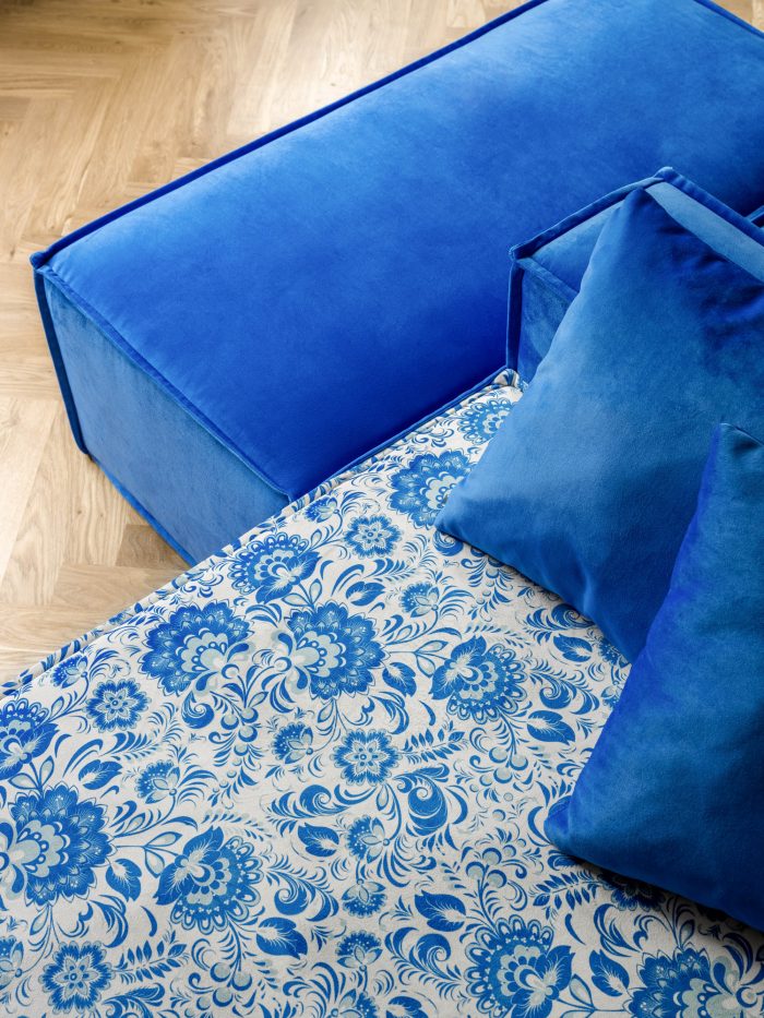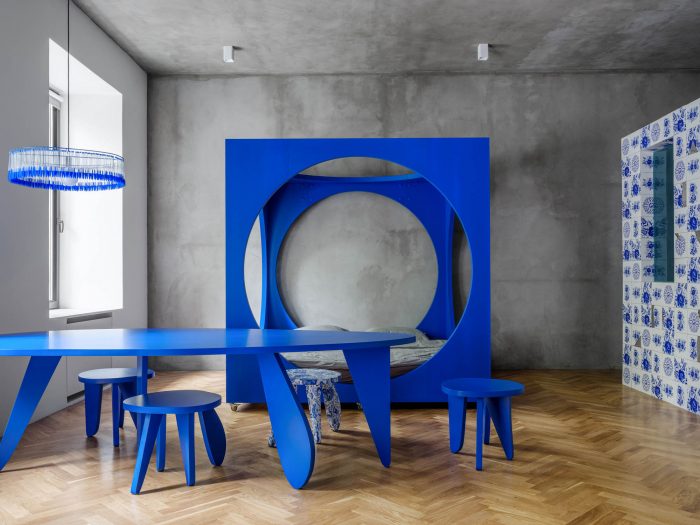 Nuriev describes this color to be memorisable, giving the space a sense of calmness. The blue color is featured in the custom Crosby Studios furniture as well as the monochromatic kitchen. He reimagined the Gzhel print incorporating the Crosby blue color, then featuring the print in small details on the sofa, stools, and in the kitchen. The furniture throughout the space is custom Crosby Studios. The circular bed frame is the main attraction inspired by The Phillips Exeter Academy Library built by Nuriev’s favorite architect Louis Kahn. The space also features a 360 sofa, chandelier made from BIC pens, and Crosby Studios signature table with stools.