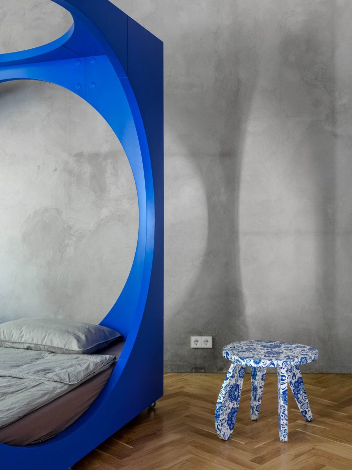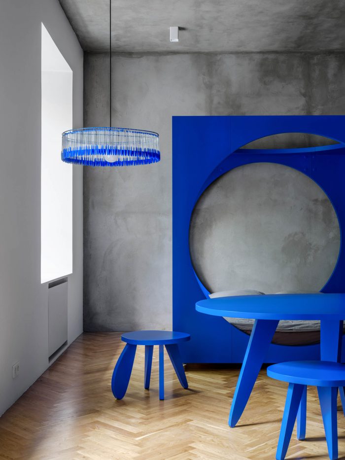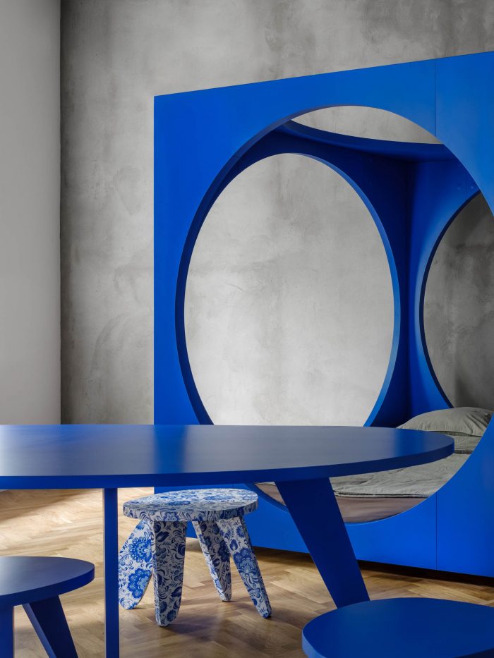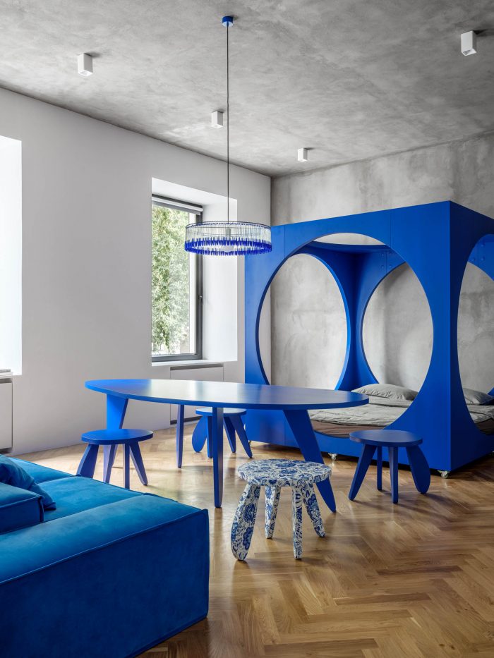 Nuriev形容这种颜色令人难忘,给空间带来一种平静的感觉。蓝色在Crosby Studios的定制家具以及单色厨房中都有体现。他将Gzhel的印花融入Crosby的蓝色重新设计,然后在沙发、凳子以及厨房的小细节中体现印花的特点。整个空间的家具都是Crosby工作室定制的。圆形的床架是主要的亮点,灵感来自于Nuriev最喜欢的建筑师Louis Kahn建造的Phillips Exeter学院图书馆。空间内还设有360沙发、BIC笔制作的吊灯、Crosby Studios标志性的桌子与凳子。