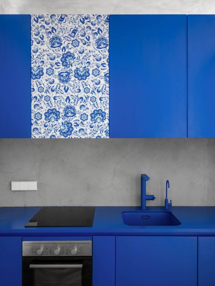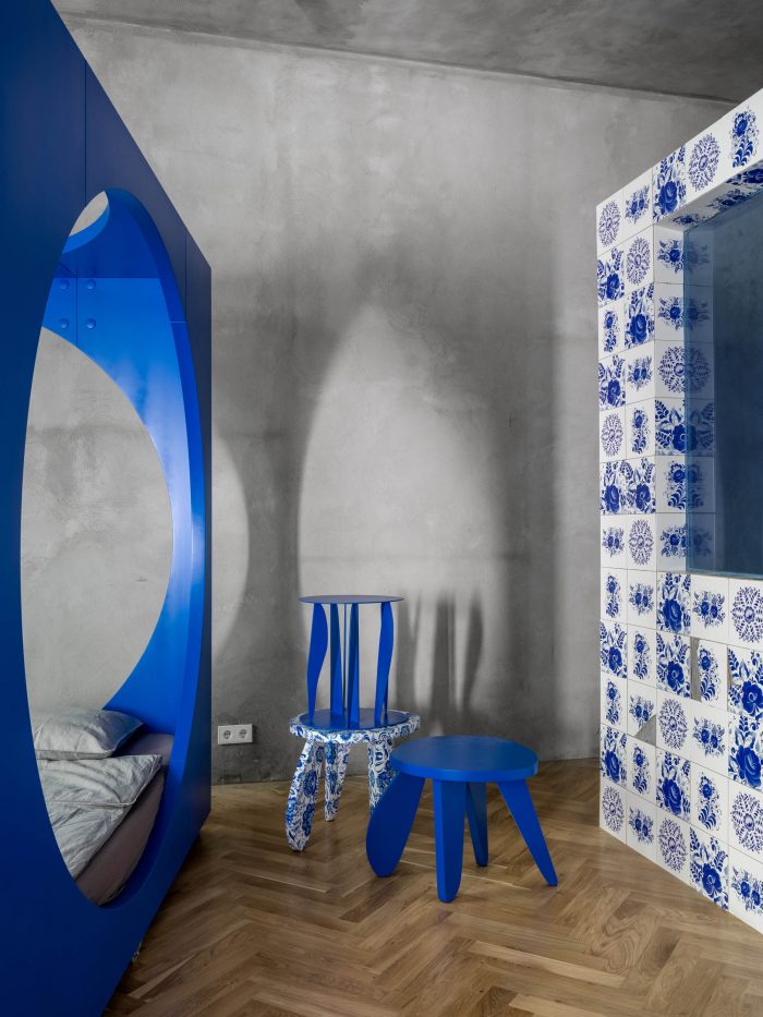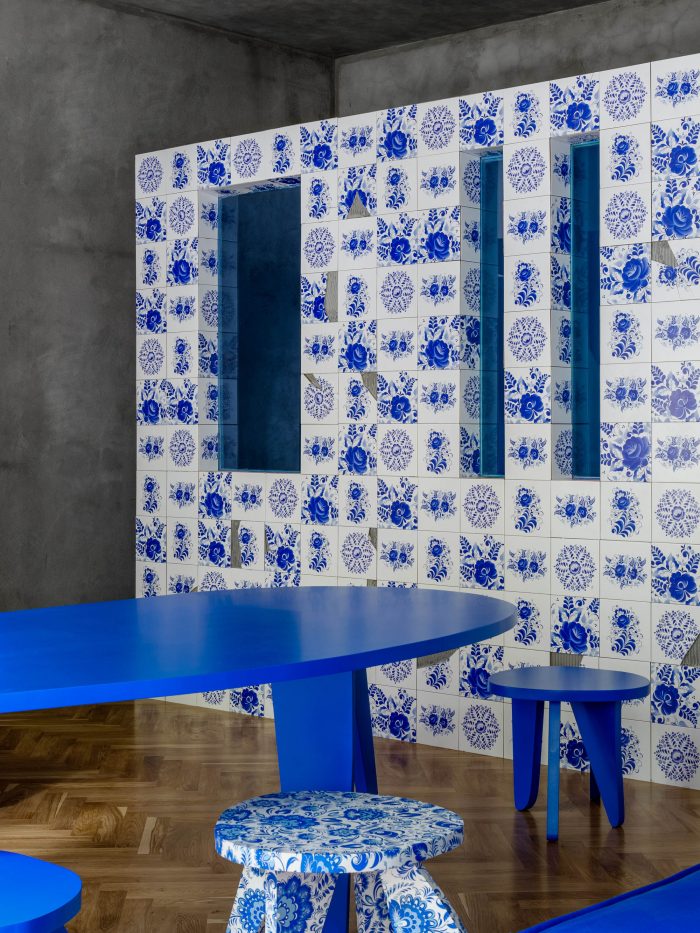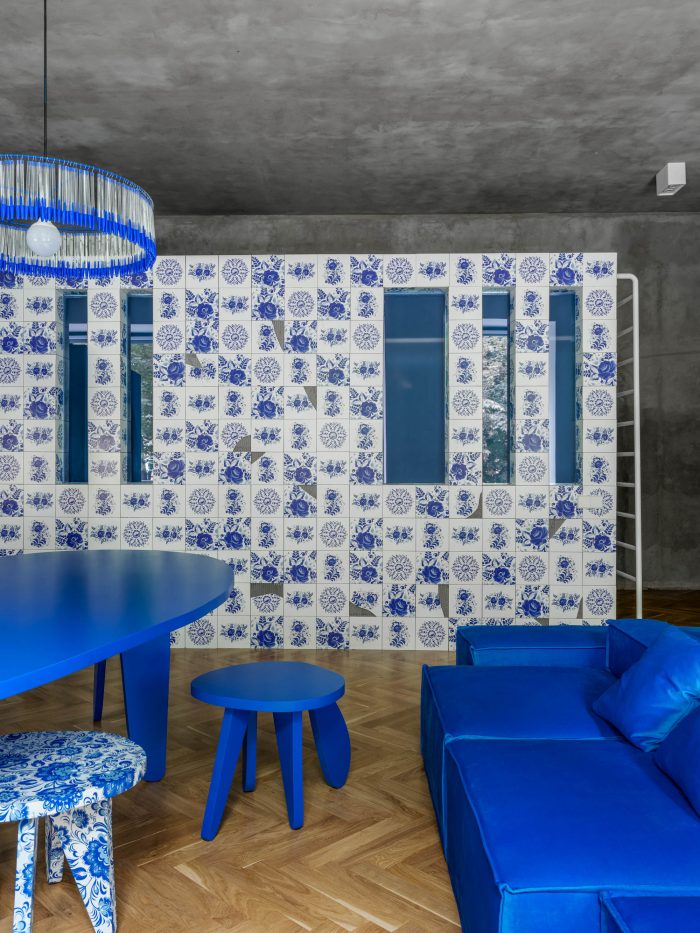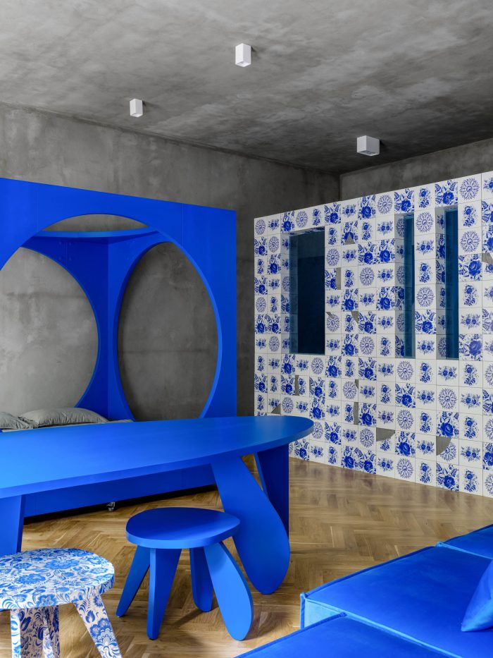 He built out a section of the right side of the space for the second zone, designating it for the utilities - kitchen, laundry, wardrobe, and bathroom. The walls of the utility zone are not attached to the ceiling, giving it a sculpture feel as if it was a shop inside a shop. Concrete is the main material, allowing rawness and sophistication to prevail while effortless supporting the blue color. Broken tiles cover the utility wall in a unique and classic Russian print called Gzhel - from Nuriev’s heritage and childhood. Crosby Studios signature blue color is seen throughout the space.