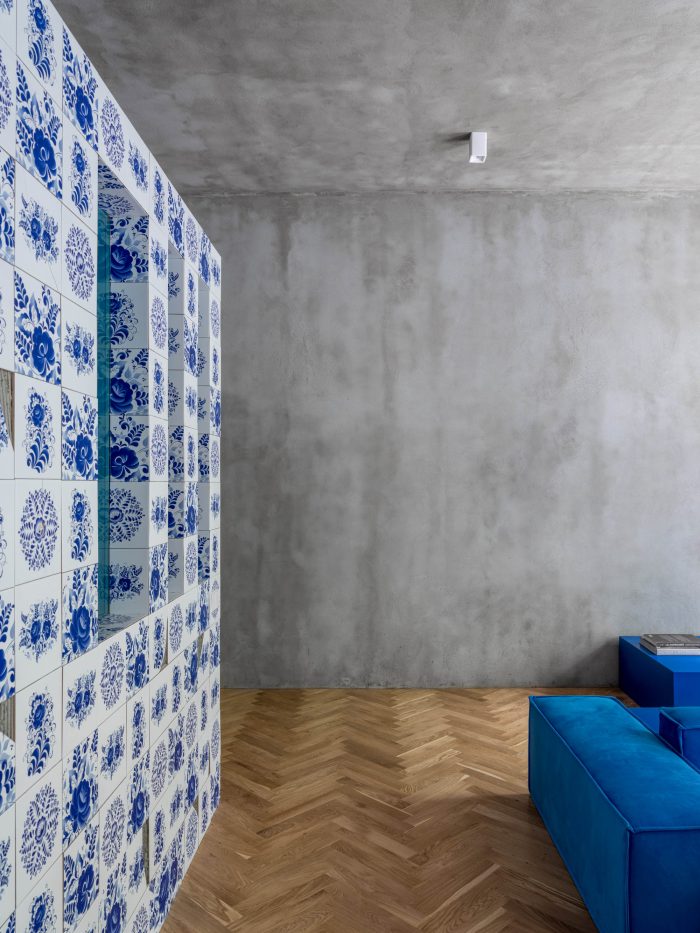 他在空间右侧建出一部分作为第二区域,指定为公用设施--厨房、洗衣房、衣柜和卫生间。公用设施区的墙面没有与天花板相连,让它有一种雕塑的感觉,仿佛是一个店中店。混凝土是主要材料,让生硬和精致占据上风,同时毫不费力地支撑着蓝色。破碎的瓷砖以独特而经典的俄罗斯印花图案Gzhel--来自Nuriev的传统和童年。Crosby Studios标志性的蓝色贯穿整个空间。