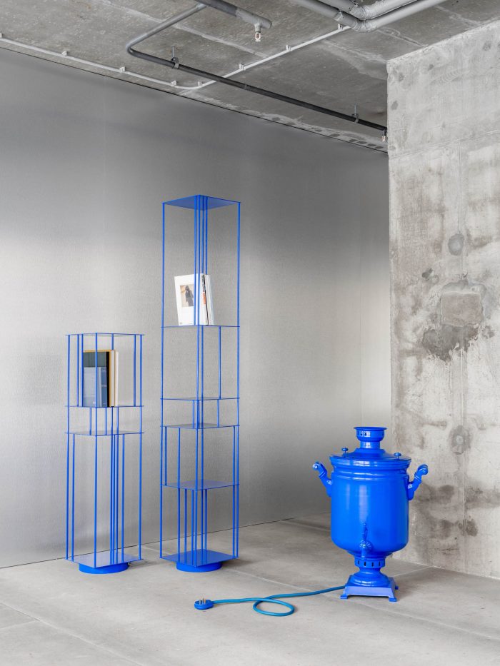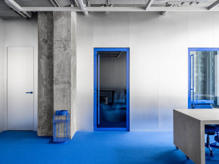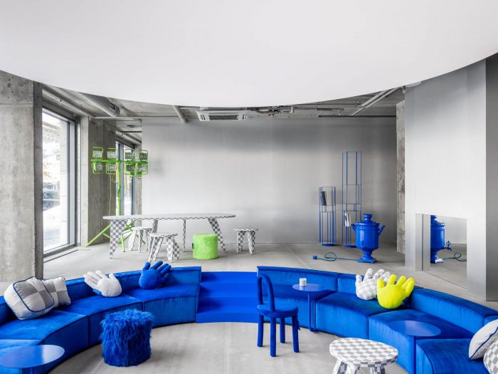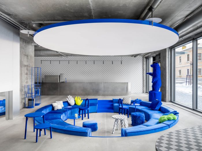 The space is also equipped with a café and bar, which functions more like an experimental gastronomy lab. The menu features an assortment of cobalt blue foods, including blue patisserie, blue loaves of bread, blue chocolate bars, gourmet sandwiches with blue buns, and blue glitter champagne, among other ‘Crosby Blue’ bites. Food items are dyed naturally using butterfly pea flower powder and charcoal powder.