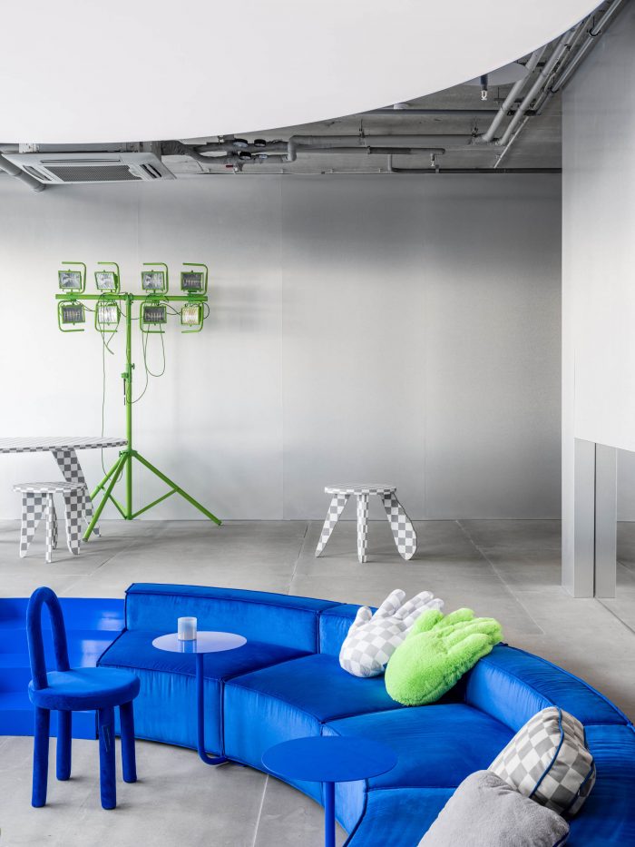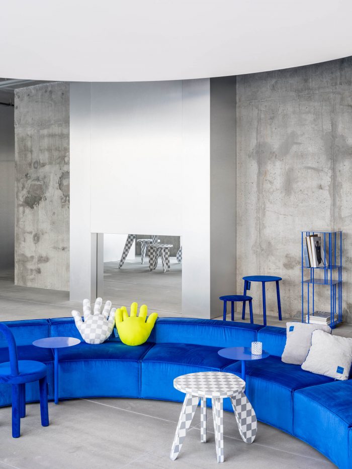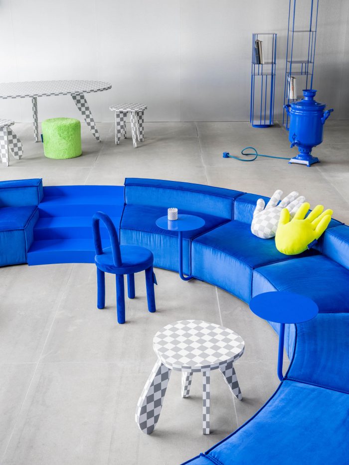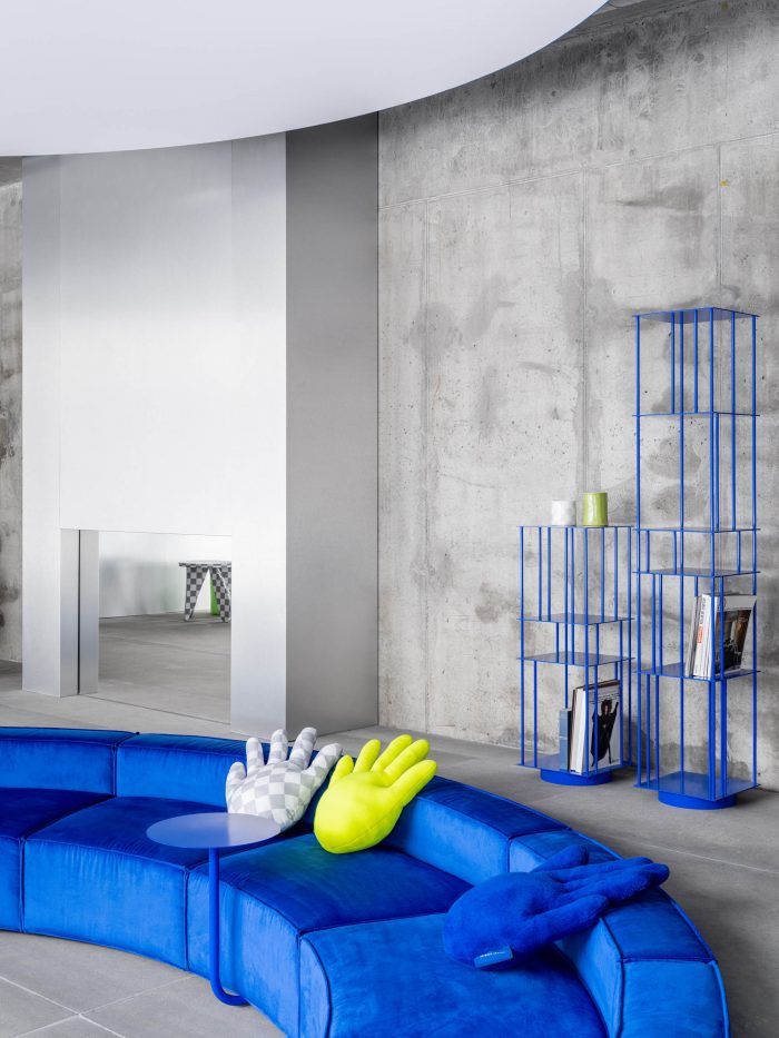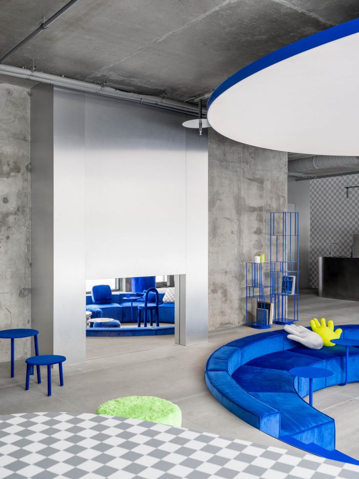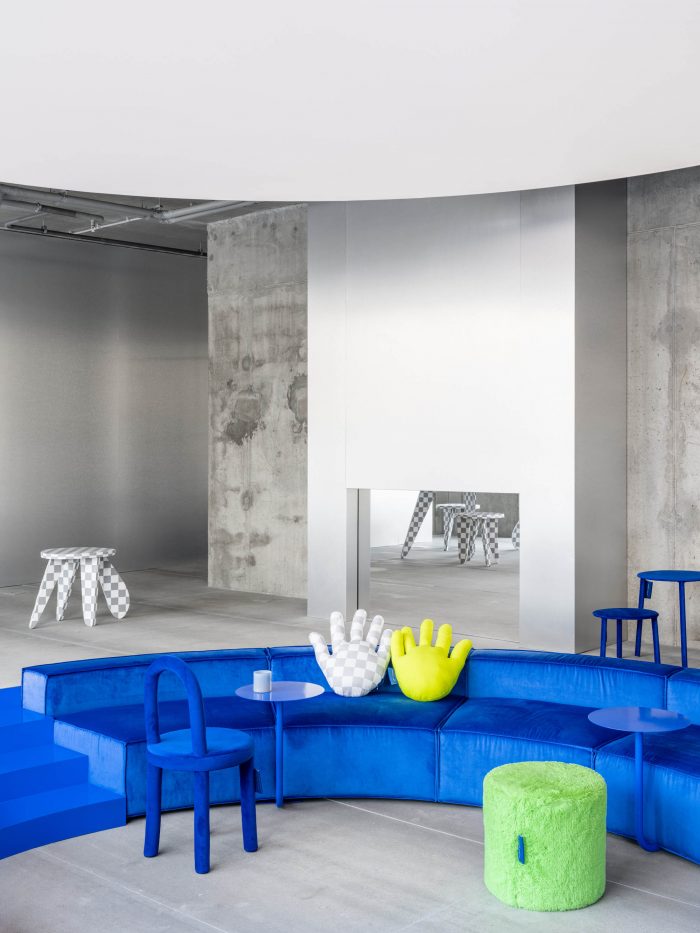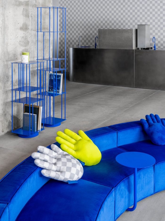Upon entering the 220 square meter flagship, visitors encounter a sunken blue lounge reminiscent of a pool of water, surrounded by an installation of furniture and home goods from Crosby Studios Home's debut collection. The eclectic, eye-catching pieces include velour dining chairs; rugs in the shape of elegant swans and shopping bags; humanoid body pillows; a furry blue ottoman; and powder-coated bookcases.