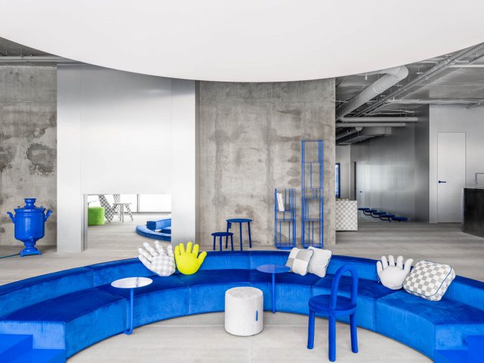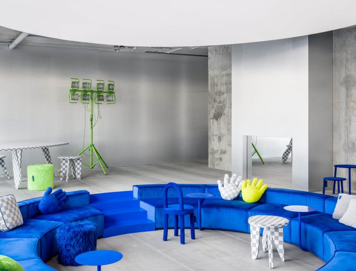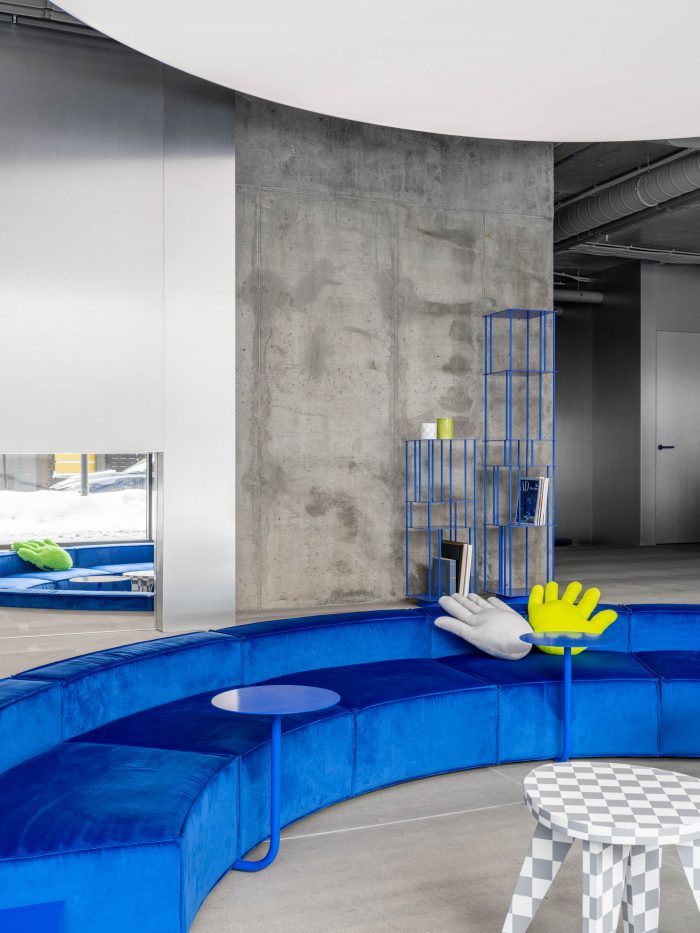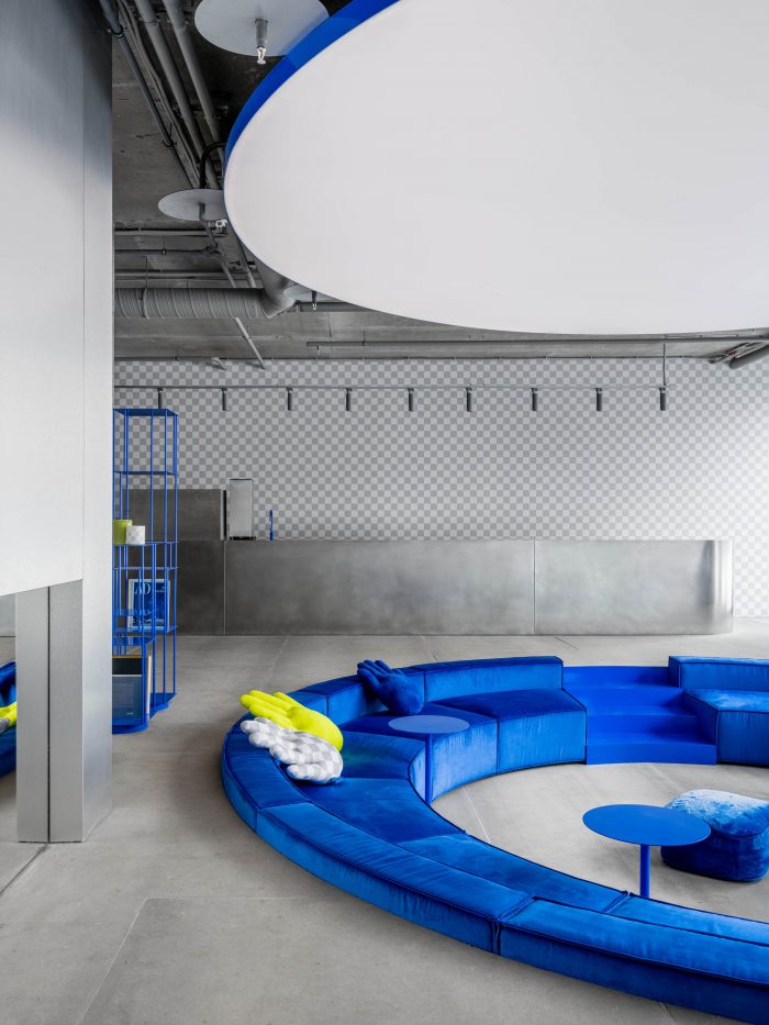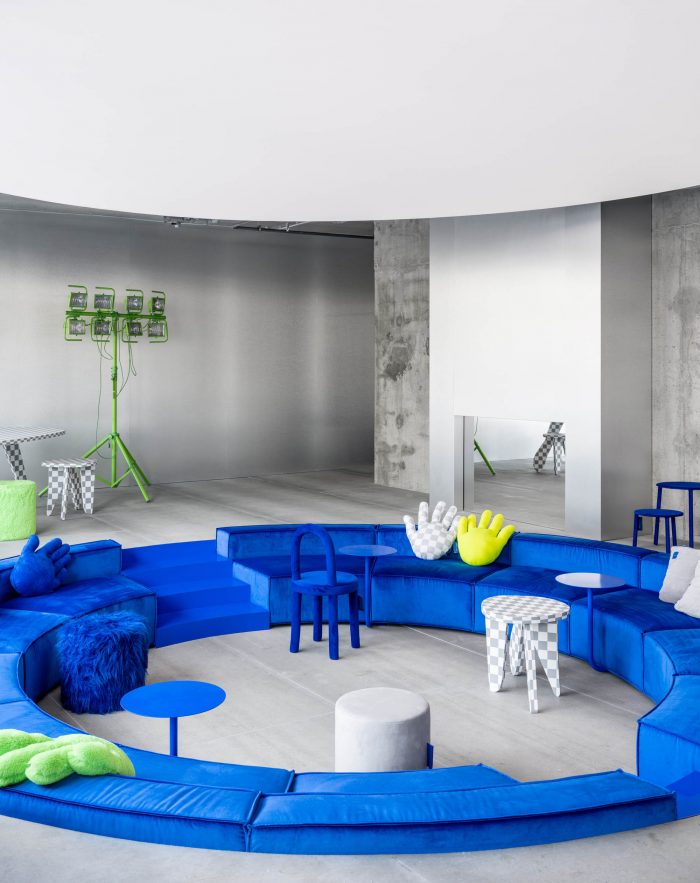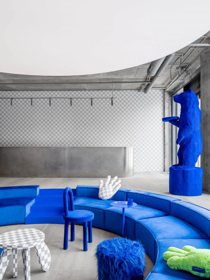 一进入220平方米的旗舰店,参观者就会遇到一个下沉式的蓝色休息室,让人联想到一池水,周围是Crosby Studios Home首发系列的家具和家居用品装置。这些不拘一格、引人注目的作品包括天鹅绒餐椅;优雅天鹅和购物袋形状的地毯;人形体枕头;毛茸茸的蓝色长椅;以及粉末涂层书柜。