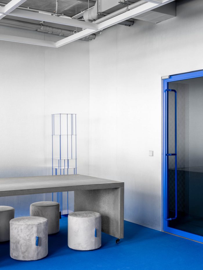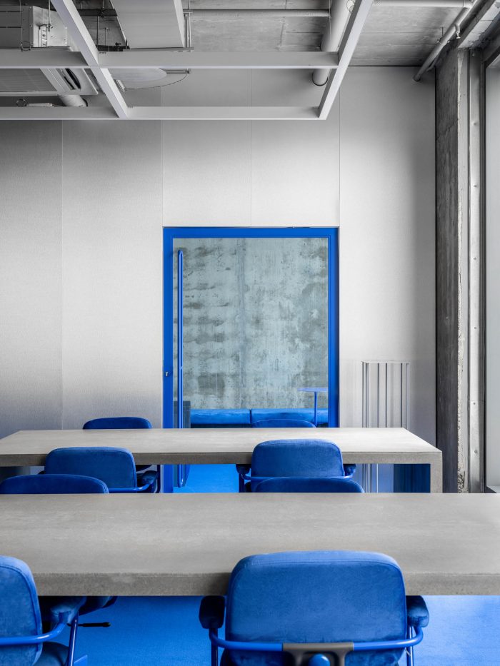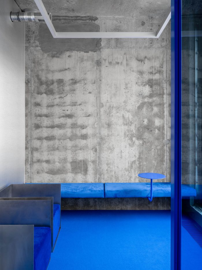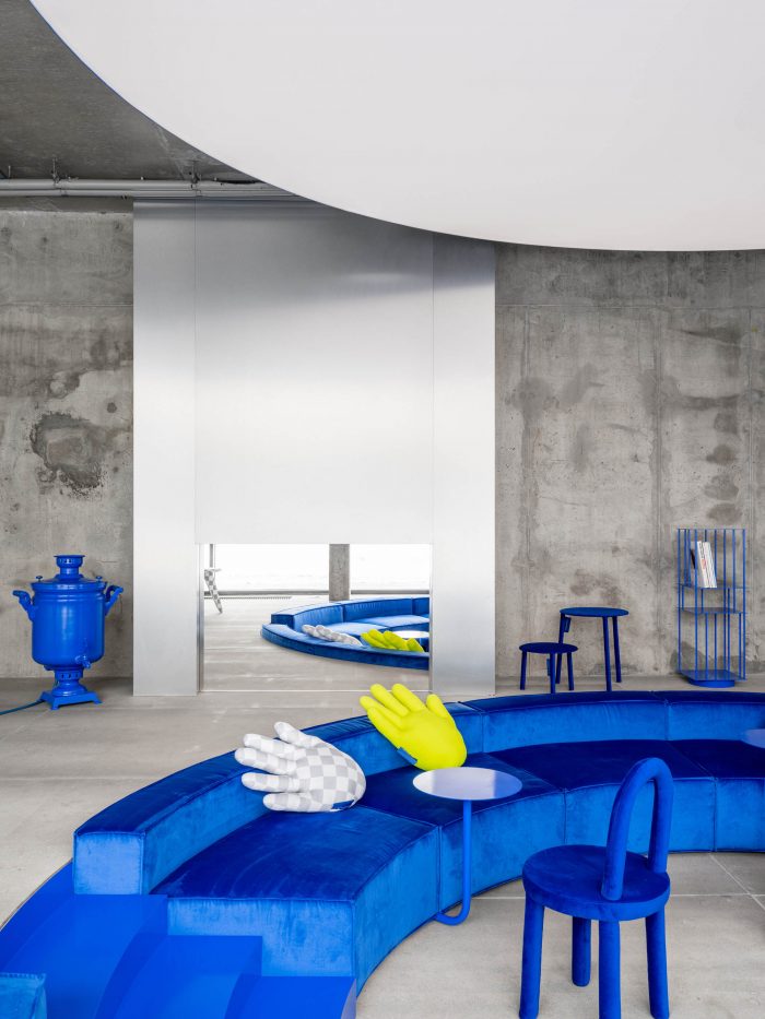 空间内还配备了咖啡馆和酒吧,其功能更像是一个实验性的美食实验室。菜单上有各种钴蓝色的食物,包括蓝色糕点、蓝色面包、蓝色巧克力棒、蓝色面包的美食三明治、蓝色闪光香槟等 "克罗斯比蓝 "小食。食品采用蝴蝶豌豆花粉和木炭粉自然染色。