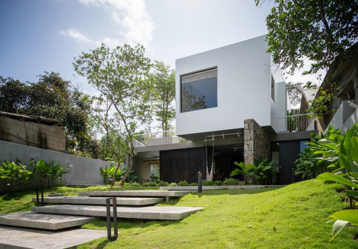 We planted a large tree with shade on the ground floor that penetrates the balcony upstairs to cool the area in the summer. In addition, we also use a solid-hollow contrast technique. The ground floor is designed to be as open as possible, to connect the landscape front and back, and to promote natural elements and ventilation. The first floor is a solid block with purpose-designed windows. In today's modern world, the living area of trees is getting smaller and smaller, as an architect - a person who has the ability to direct other people's living habits, we want to direct people to nature, coexistence, and respect for nature. "If you truly love nature, you will find beauty everywhere", said Vincent van Gogh.