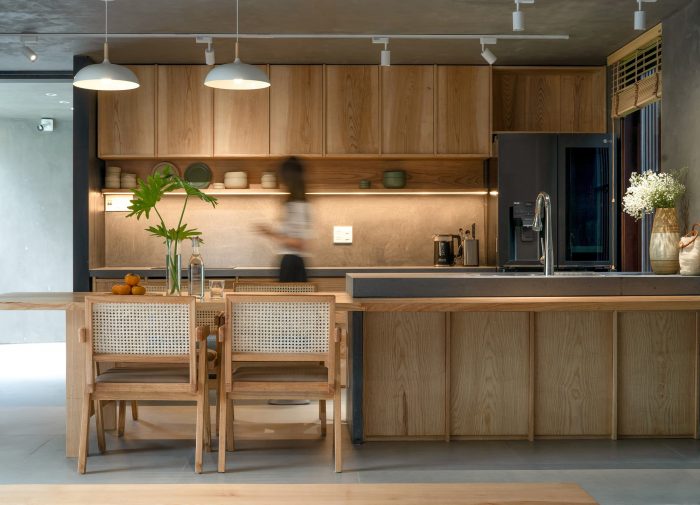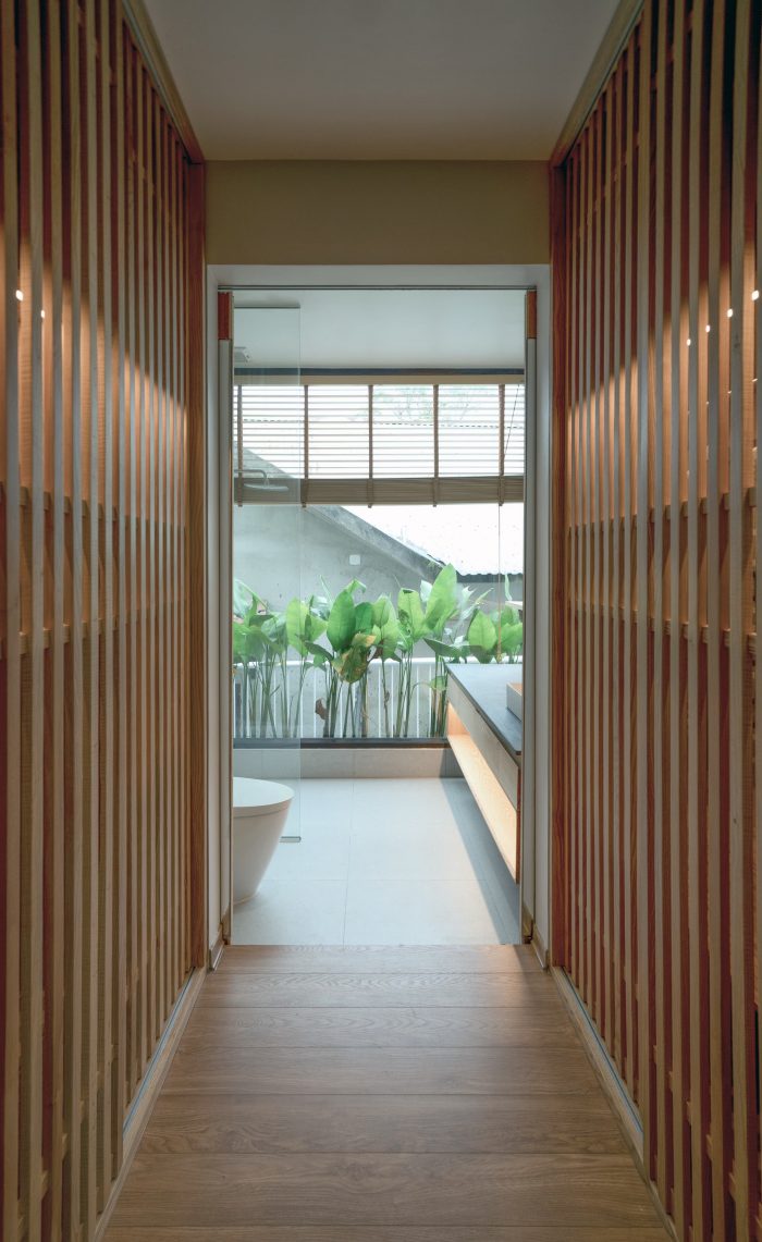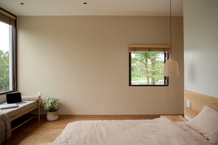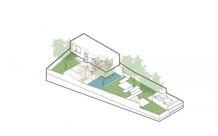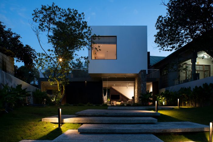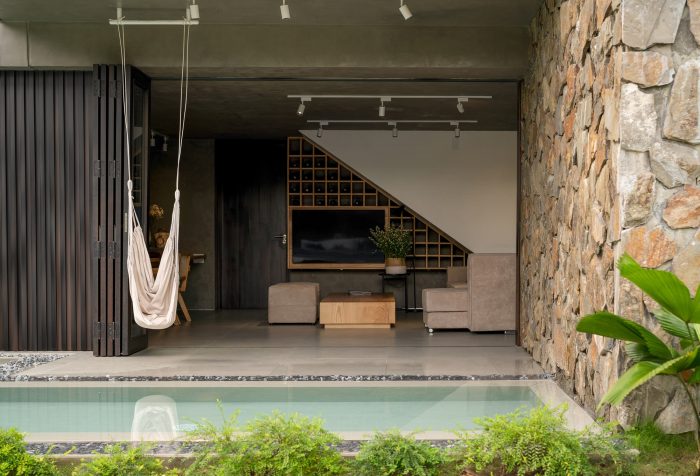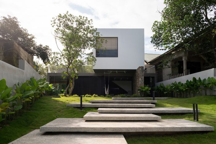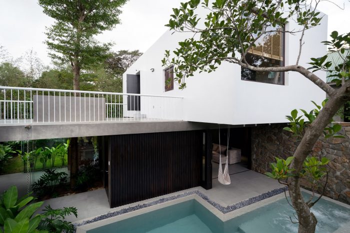 The ground floor is designed with the simplest form possible, it is a horizontal continuation from the fence wall, stretching across the horizontal land, dividing the garden into 2 parts: the front area is the entrance with the parking lot, swimming pool, outdoor party area, behind is a garden with vegetables and fruit trees. The first floor is arranged perpendicular to the ground floor and stretches along the land to have a view of both the front and back gardens that have been mentioned above. With the console structure reaching out 2.5m, the upper bedroom block becomes a large eave to cover the ground floor area. The eaves are an extremely important element in tropical architecture, it helps to block the hot sun shining as well as the rain in winter directly into the house.