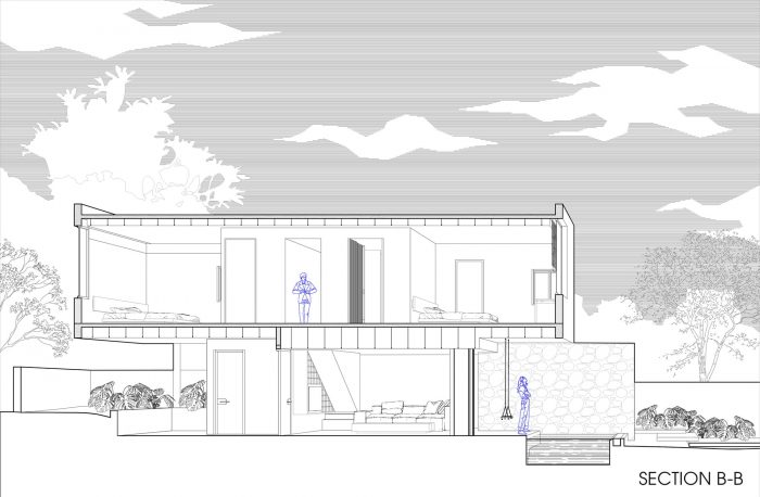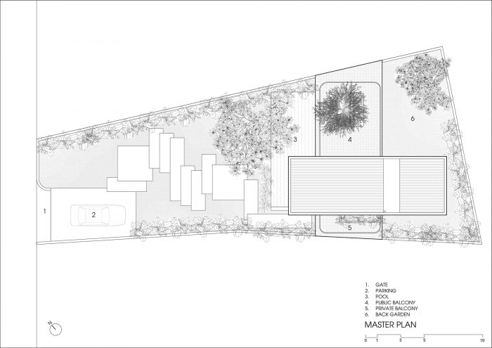 一楼的设计采用了最简单的形式,它是从围墙上水平延续下来的,在水平的土地上延伸,把花园分成2个部分:前面的区域是入口,有停车场、游泳池、户外聚会区,后面是花园,有蔬菜和果树。第一层与底层垂直布置,沿着土地延伸,可以看到上面提到的前后两个花园。随着控制台结构伸出2.5米,上层卧室区成为一个大屋檐,以覆盖底层区域。屋檐是热带建筑中一个极其重要的元素,它有助于阻挡炎热的阳光照射以及冬季的雨水直接进入屋内。