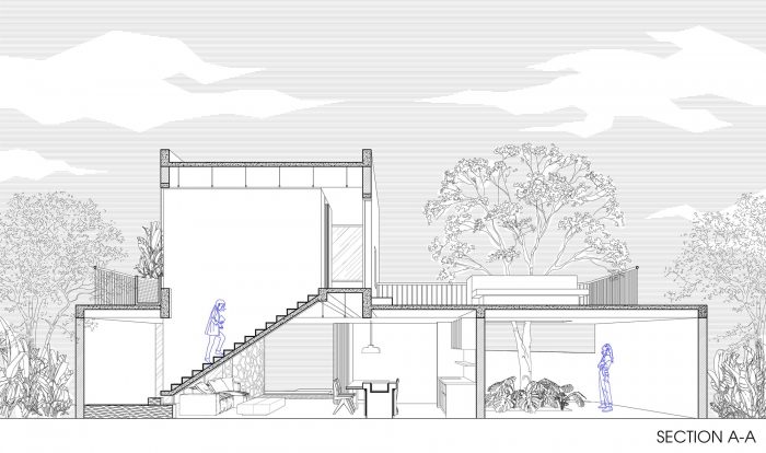 我们在一楼种植了一棵有树荫的大树,它能穿透楼上的阳台,在夏天为该地区降温。此外,我们还采用了实心-空心对比技术。一楼的设计尽可能地开放,连接前后的景观,促进自然元素和通风。一楼是一个坚固的街区,有专门设计的窗户。在当今的现代社会,树木的生存面积越来越小,作为建筑师—一个有能力引导别人生活习惯的人,我们要引导人们走向自然,共生,尊重自然。文森特-凡高说:"如果你真正热爱自然,你会发现美无处不在"。