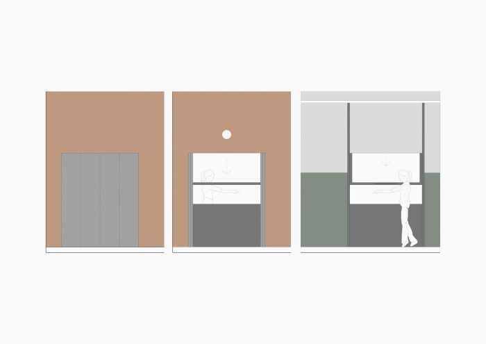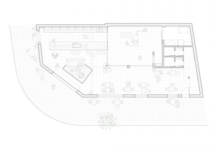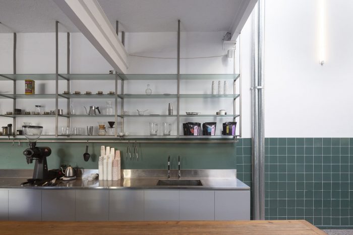 在那里进行的活动在分配构成这个大空间的两个固定元素方面具有决定性意义:咖啡烘焙机和酒吧。生产区与咖啡机一起被定义在双层高度的空间中,其中灯罩有1/3的表面是透明的,以便头顶的光线进入。通过这种方式,产生了一个空间的划定,在这个空间里可以观察到与机器的生产互动。另一个决定性的元素是咖啡吧,一个7米长的单一材料块,被纳入单层高度的空间,并连接生产部门和街道。就在那里,一个铁窗栏出现了,作为咖啡派送和与人行道连接的元素。这个装置根据需要有两种可能的机制,断头台玻璃窗格和允许它们完全关闭的折叠门。其余的空间可以自由地接受必要和灵活的家具。