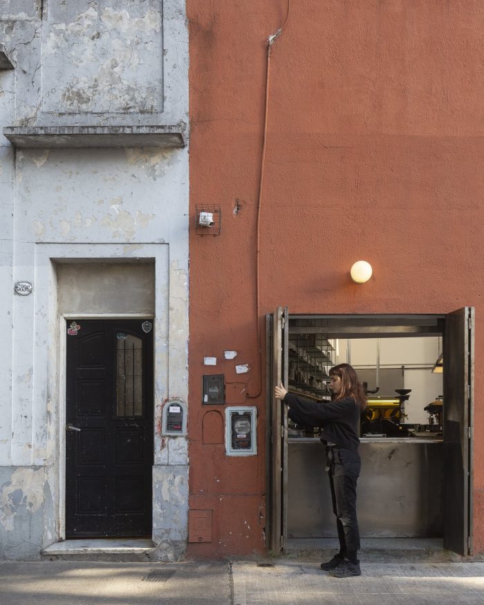 The activities carried out there are decisive in distributing the two fixed elements that make up the large space: the coffee roasting machine and the bar. The producing area is defined with the coffee machine in the double-height space, where the light cover has 1/3 of its surface transparent for the entry of overhead light. In this way, a delimitation of the space is generated in which the productive interaction with the machine can be observed. The other determining element is the coffee bar, a 7m-long mono-material block that is incorporated into the single-height space and connects the productive sector with the street. Right there, an iron window bar appears as an element for coffee dispatch and connection with the sidewalk. This device has two possible mechanisms as required, guillotine glass panes and folding doors that allow them to be completely closed. The rest of the space is left free to receive the necessary and flexible furniture.