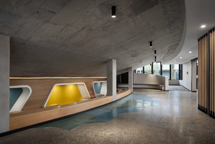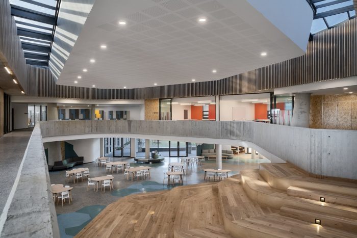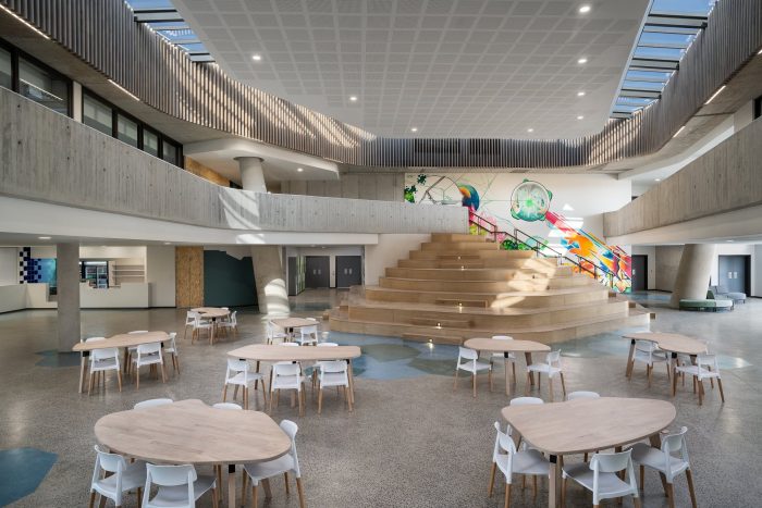 The U-shaped building footprint frames the southern corner of the site, which formulates a forecourt defined by the auditorium and hall on either side. It ‘embraces’ the learners and visitors as they enter, while also acting as a protective buffer from the elements. A direct visual connection to the main entrance makes wayfinding easier for users. The conventional ‘school typology’ consisting of classrooms that are framed by four walls was challenged with the concept of constant interaction between spaces. The classes become permeable and adaptive with furniture, such as combinable tables, designed specifically for the hybrid and flexible use of each space. Diversity is emphasized through juxtaposed slanted columns and colors in this dynamic atrium learning space, embracing difference and uniqueness in a collective and safe environment.