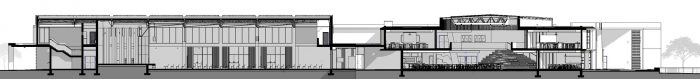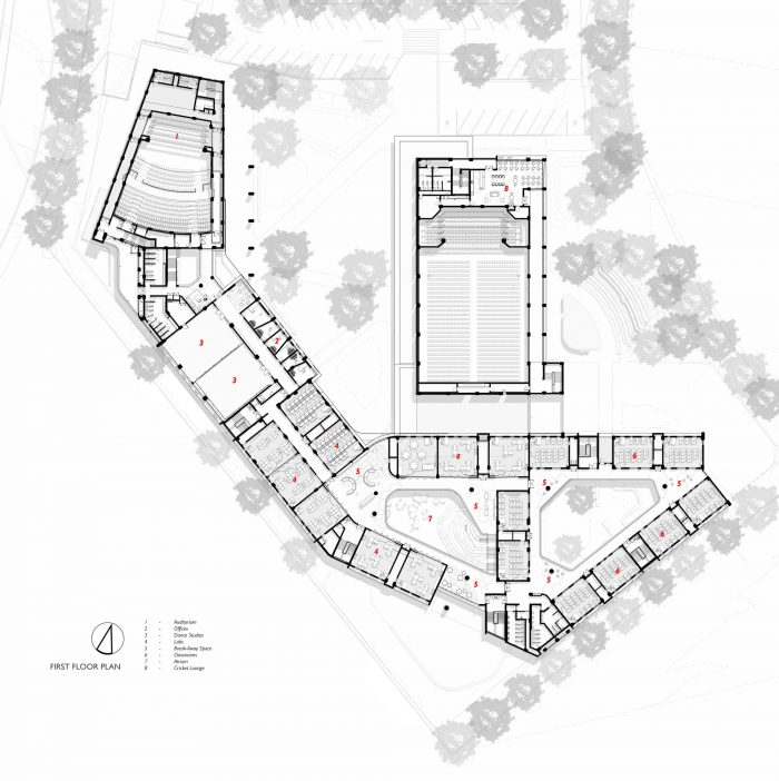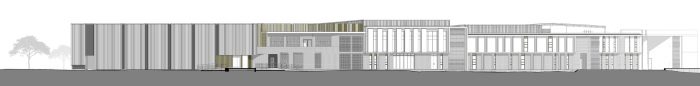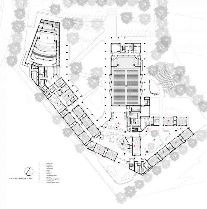 Patterned brickwork acts as a wayfinding method at entrances while contributing to the aesthetics of the building. The auditorium is clad in sheet metal which forms a prominent node at the main entrance. Off-shutter concrete roofs link the program components (auditorium, classroom spaces, and hall). This finish is pulled through to the interiors and complimented with the warmth of natural wood elements. Overall, the school responds to the site through its sustainability considerations and non-stylized architecture. Ultimately, the building’s success relies on the successful incorporation of its users, shifting from conventional to flexible and interactive learning spaces.