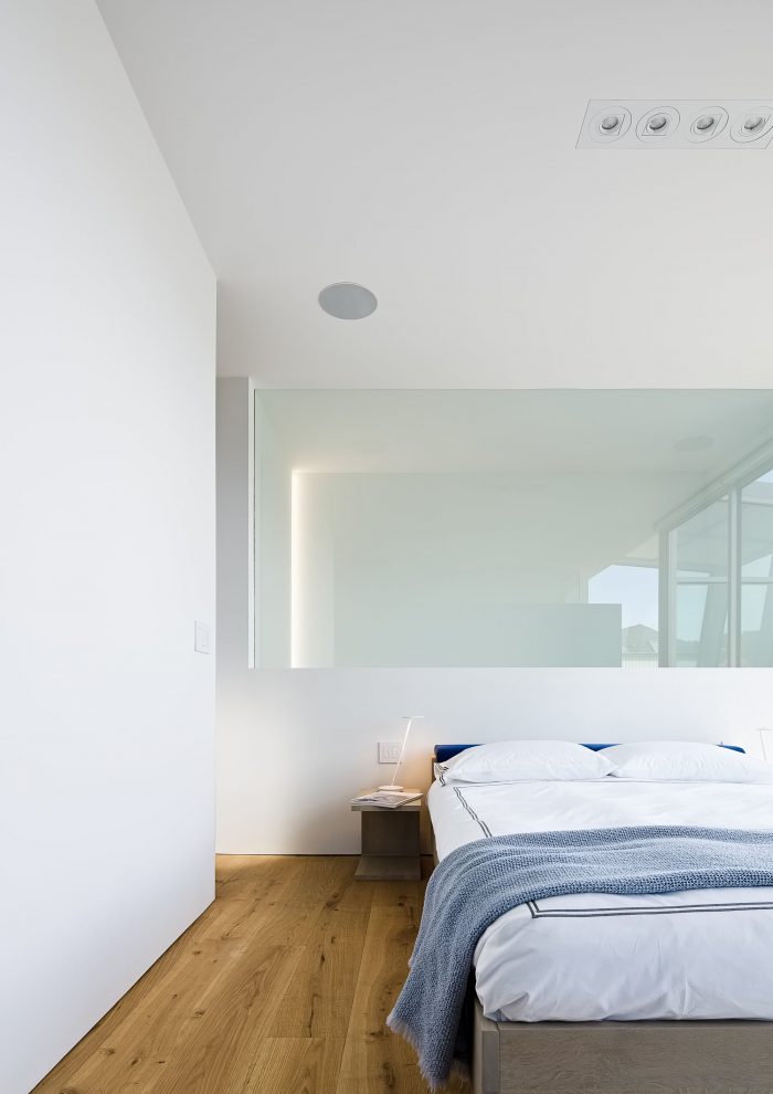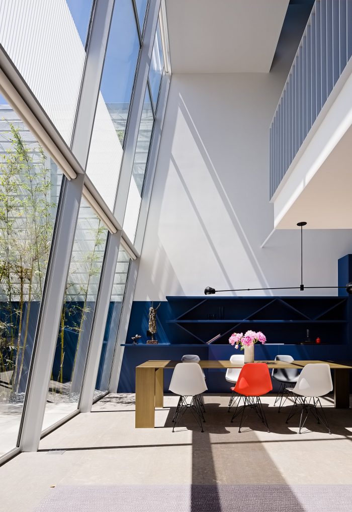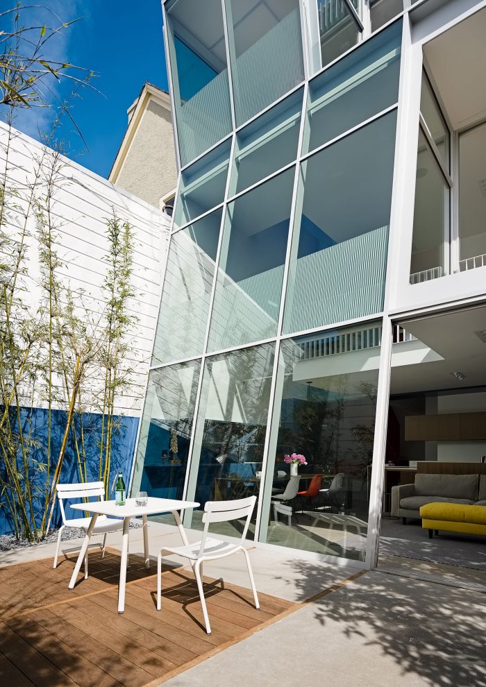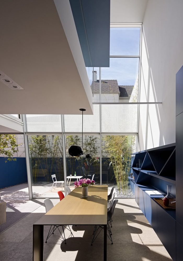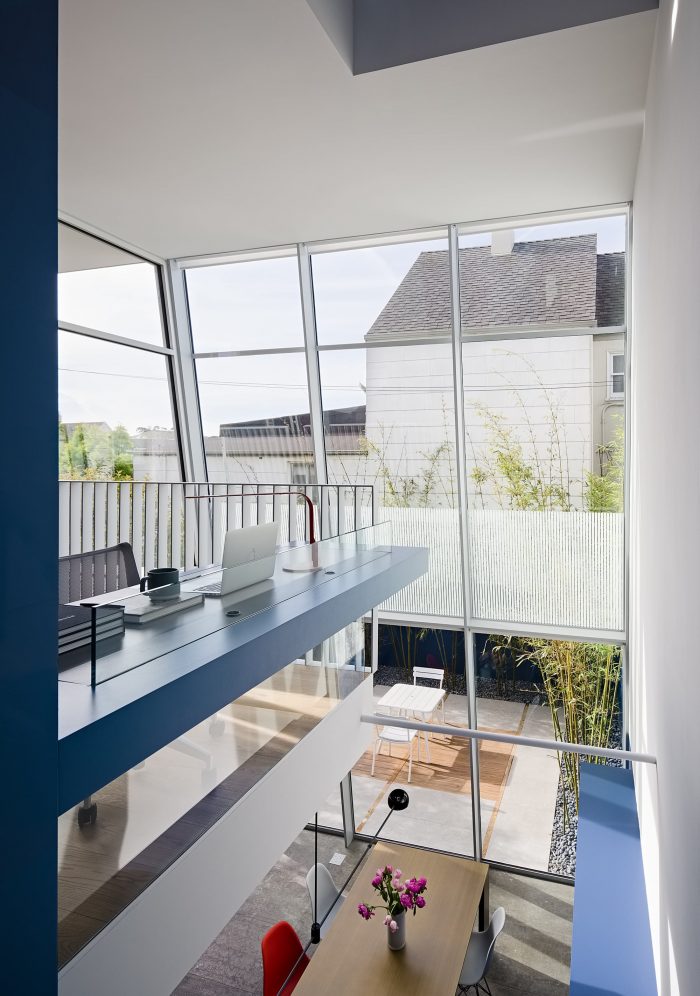 In order to maximize the small footprint of the house, the ground floor was excavated at the rear extension. The back façade, which is tilted at 9 degrees, is built of a custom field-glazed steel frame with insulated glass. The angle over two stories–a canted facade–maximizes space and square footage in the house.