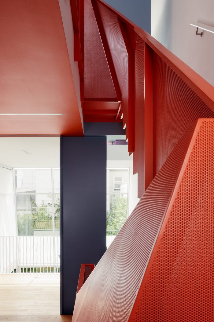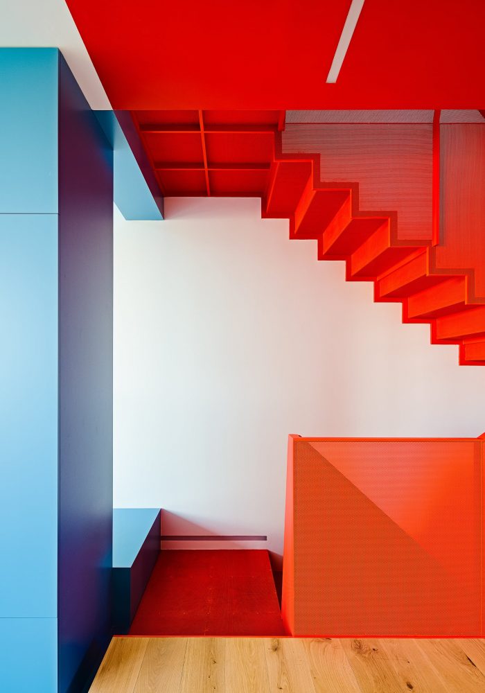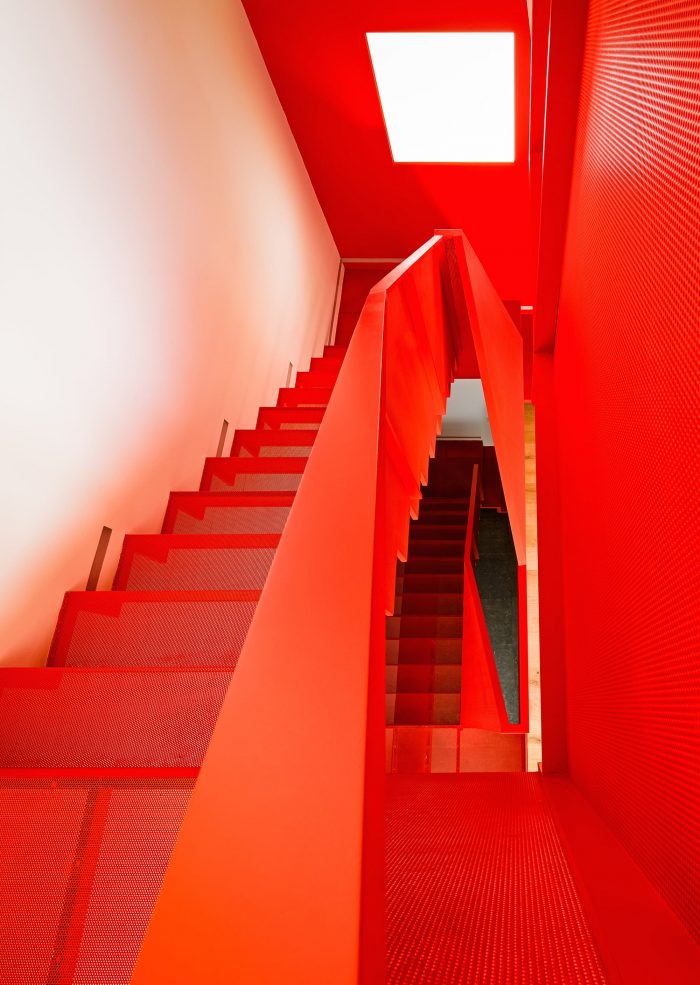 为了最大限度地利用房屋的小面积空间,在后部的延伸部分开挖了底层。后面的立面倾斜了9度,是由一个定制的现场釉面钢架和绝缘玻璃建成的。超过两层楼的角度--一个倾斜的立面--使房子的空间和面积达到了最大化。