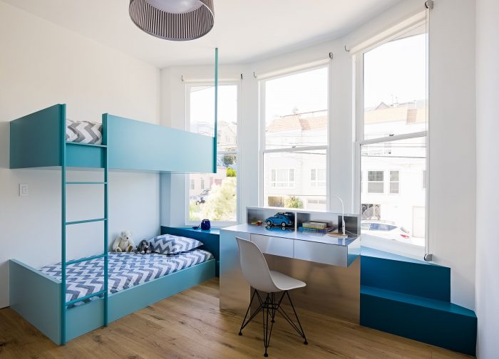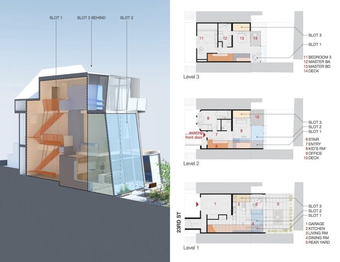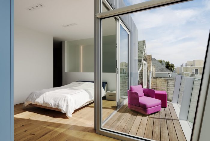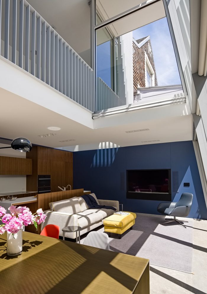 In order to create a modern home, the existing interior structure had to be completely reorganized. We reversed the original flow, turning the back of the site into the main living area. Each floor is placed between three slots so that the home connects vertically rather than horizontally. Traditional Victorian homes often are poorly lit and are disconnected from floor to floor but by suspending floors, there is brightness and fluidity throughout the Cut Out House. In this exceptionally narrow lot (65 feet x 25 feet), solar orientation and natural light diffusion were paramount for making sure the home felt warm and open.