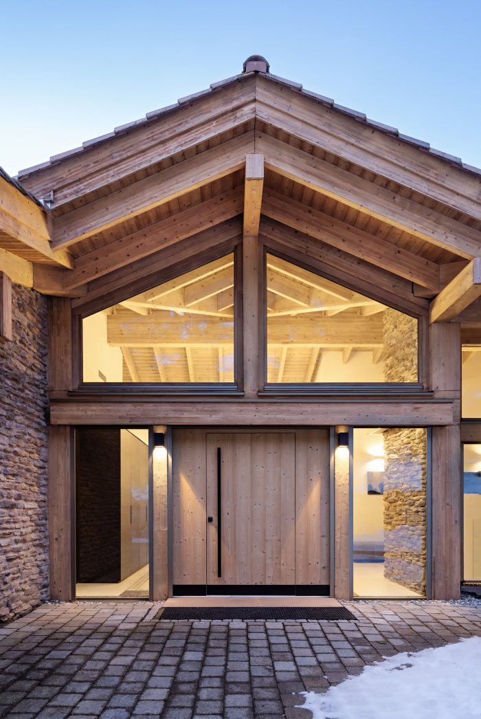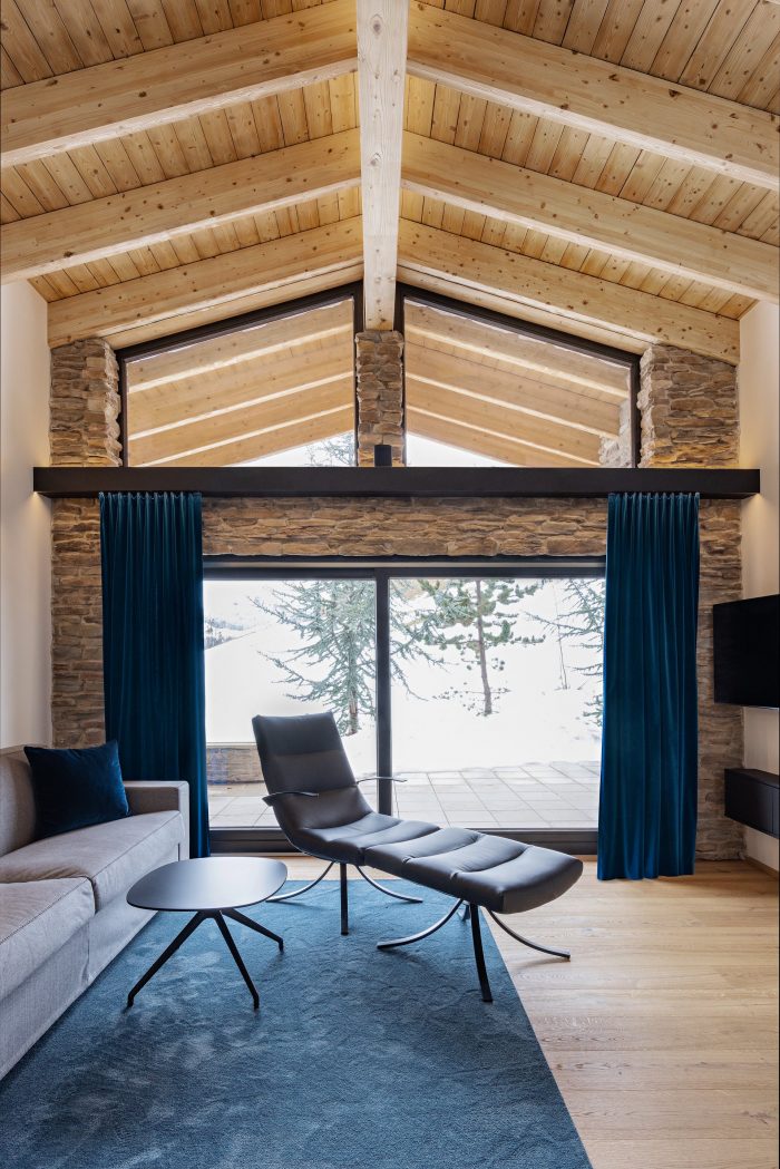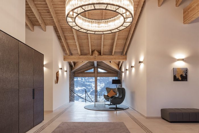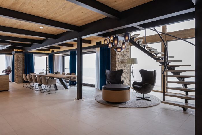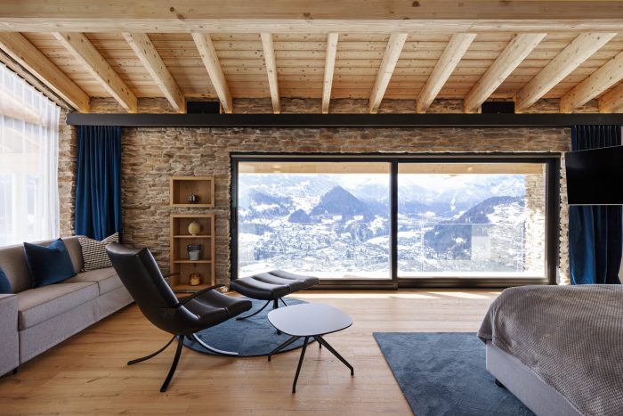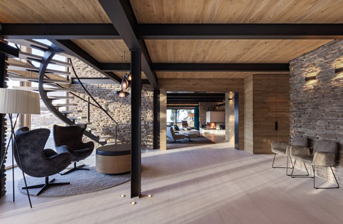 The contemporary redesign breathes new life into the existing building and sets it in dialogue with its surroundings. Oakwood, dry stone walls, and exposed beams give the chalet a typical alpine flair. The wood of the exterior areas was treated back to its original appearance.