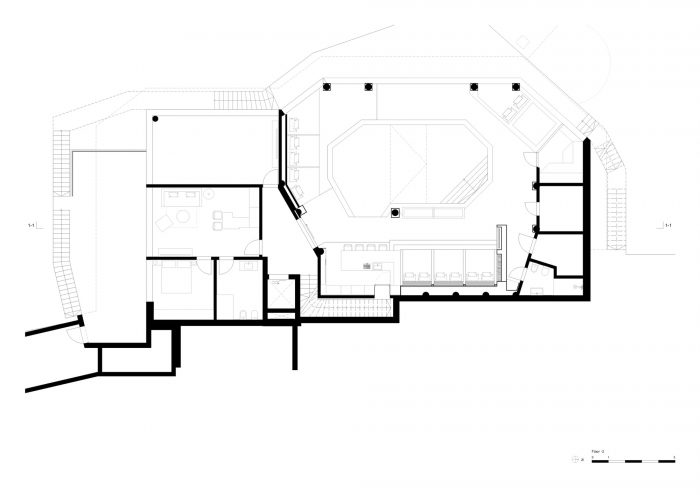 在内部,横梁已被修复,并通过深色的颜色使其可见。每层楼的大窗户提供了周围山脉的不同景色。浅色的橡木和众多的壁炉创造了一个温暖的环境,室内设计中的蓝色调是对水的一种点缀--这是温泉区放松的核心元素。