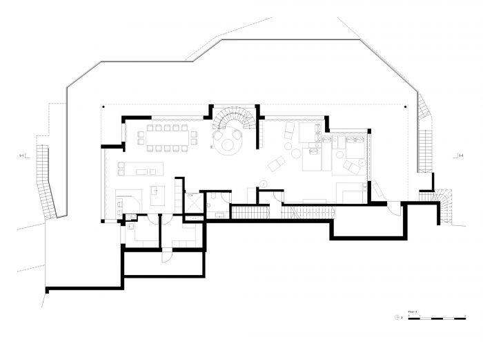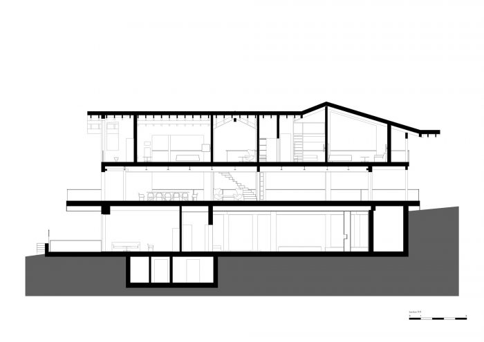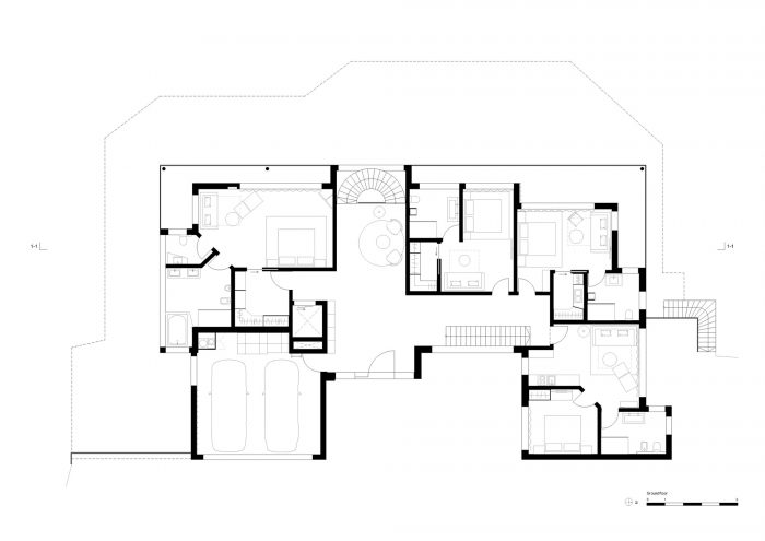 四间宽敞的卧室有自己的休息区和浴室,为顶层的人提供了撤退和放松的机会。现代化的厨房,以及位于中层的大型餐厅和宽敞的生活区,为公共生活创造了一个欢快的空间。一个大露台邀请客人在户外享受早餐,进行烧烤或沐浴阳光。在房子的最低层,是温泉区。软性材料的使用,柔和的色彩,以及五颜六色的LED照明,完美地促进了放松。