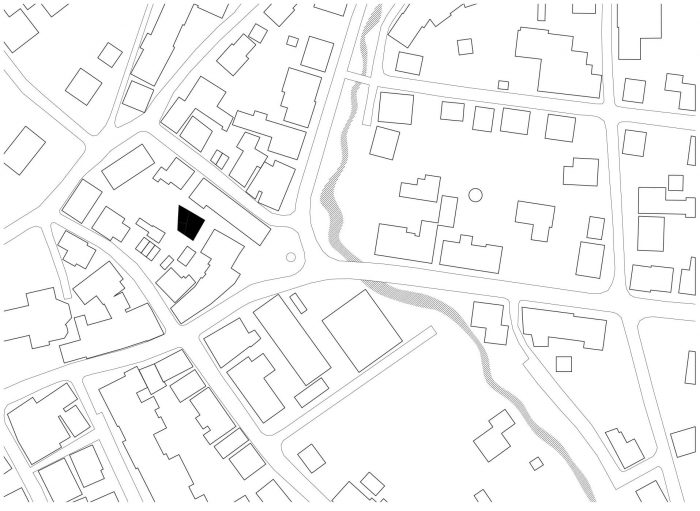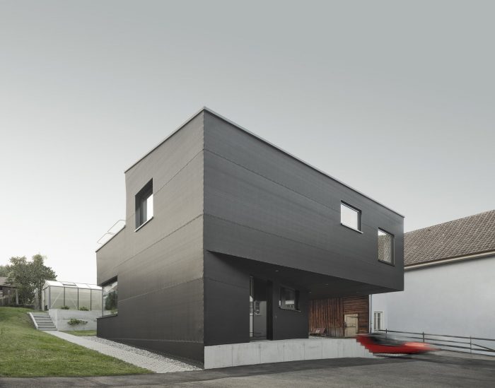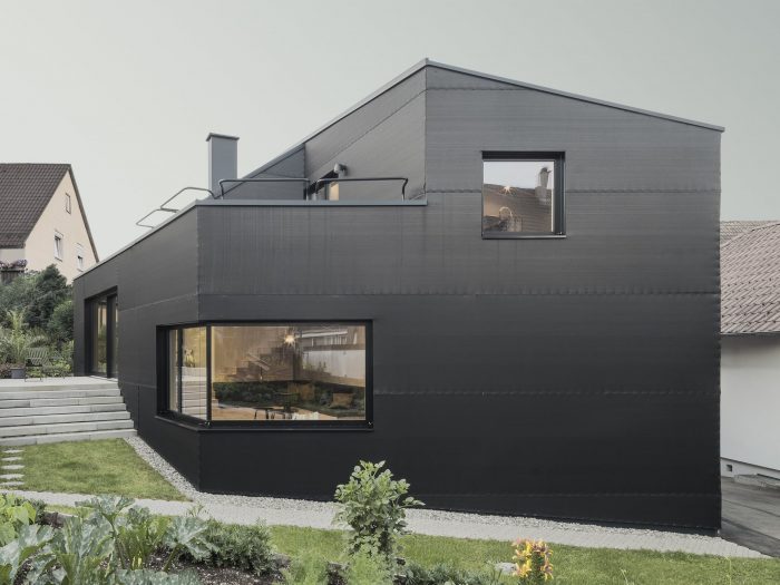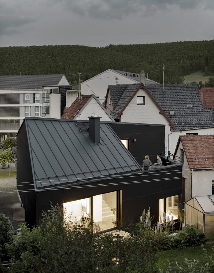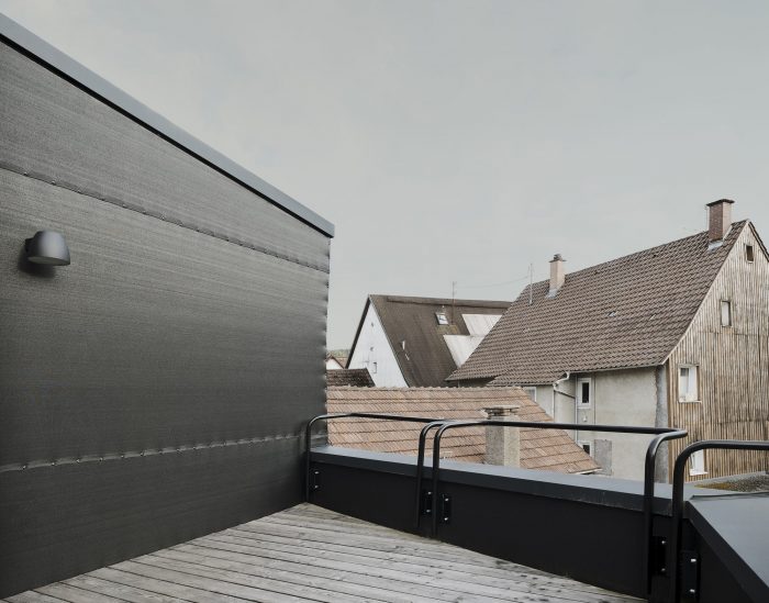 “Haus D” occupies a small site at the center of a scenic suburb of the city of Tuttlingen. Wedged tightly in between traditional buildings constructed over the last few centuries, at first glance, the property did not seem suitable for new construction at all. Nevertheless, Haus D stands here, its structure adjusted to the position of the sun, its shape determined by adjacent structures and the distances in between them. From east to west, the ground level of Haus D differs by three meters. This topographical condition drove the project’s conceptual design. On its east side, Haus D features two interior stories, a front yard and an exterior drive. On the west side, it accommodates one interior story and a back yard with an exterior garden.