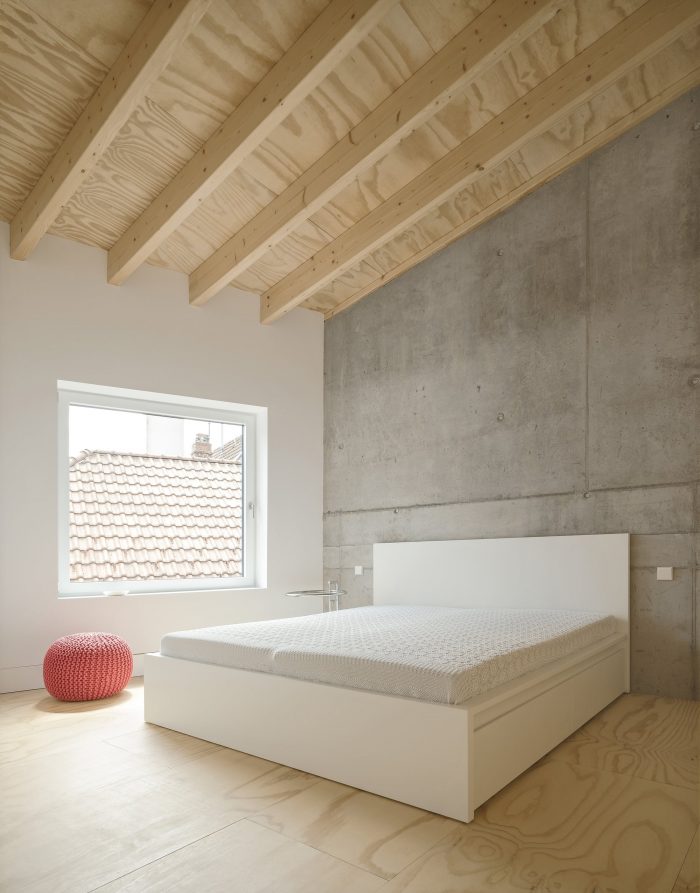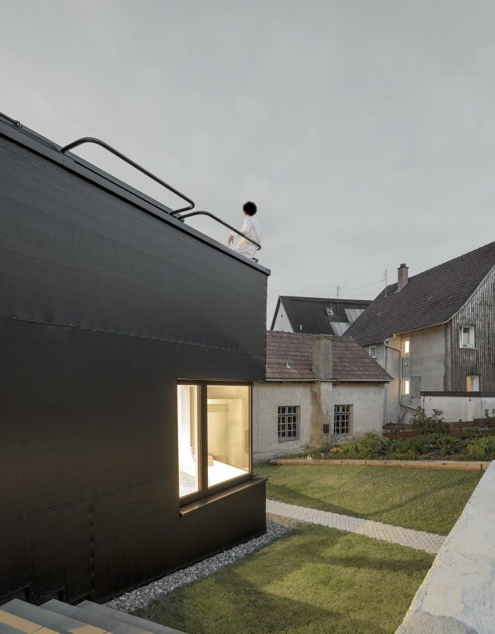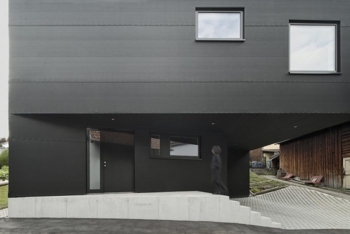 The logical arrangement of the organizational concept is further reinforced by the choice of building materials. Inside, the load-bearing concrete cross remains raw while the walls and ceilings take on the warmth of timber. The interior shell of the house is dressed in white, creating a unique interaction with the raw concrete and wood. Conversely, the exterior shell is draped with pitch black fabric and the roof, also black, stands in deliberate contrast to the reddish roofs of its heterogeneous surroundings.