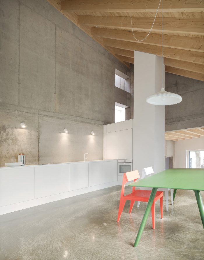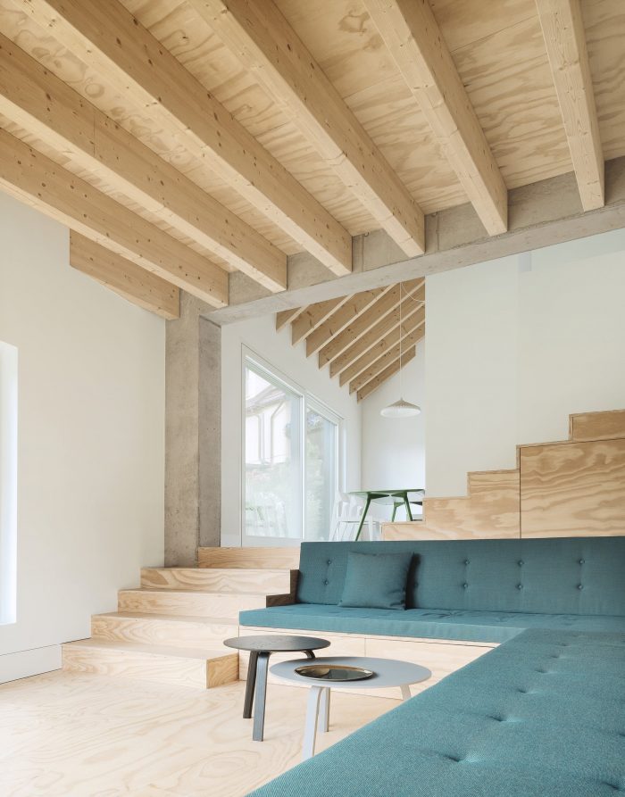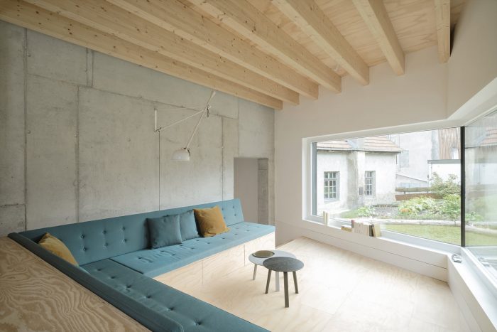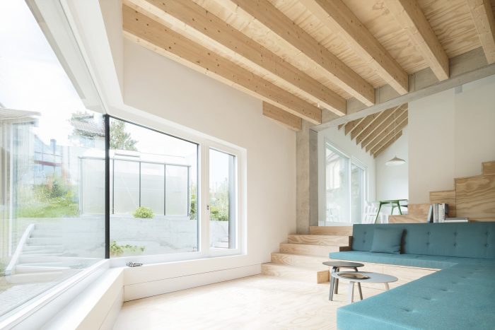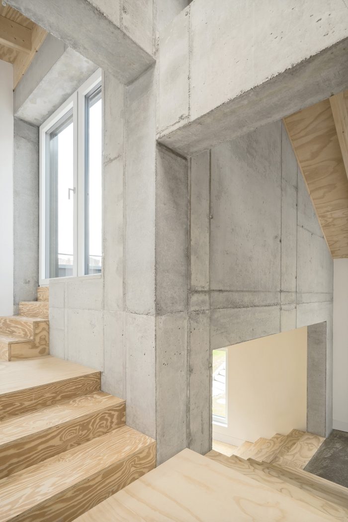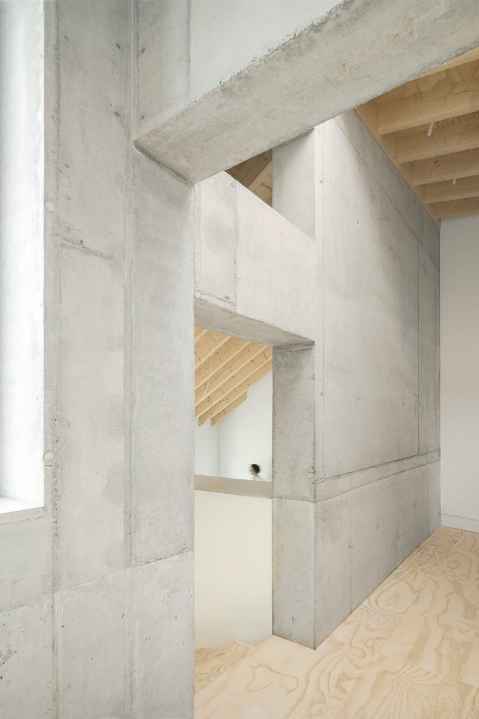 The arrangement of the respective rooms promotes cohesive und continuous interactions between each floor, creating a unique feeling of space and surprising occupants with ever- changing viewpoints and angles. Quiet retreats and unconstrained common spaces can be used simultaneously and are created effortlessly. The relation between these rooms is staged deliberately, in tune with the routine of their inhabitants. The rising sun lights the bedroom in the morning. The living area is located on the house’s sunny south side, and in the evening, cooking and dining will take place accompanied by the sight of the setting sun.