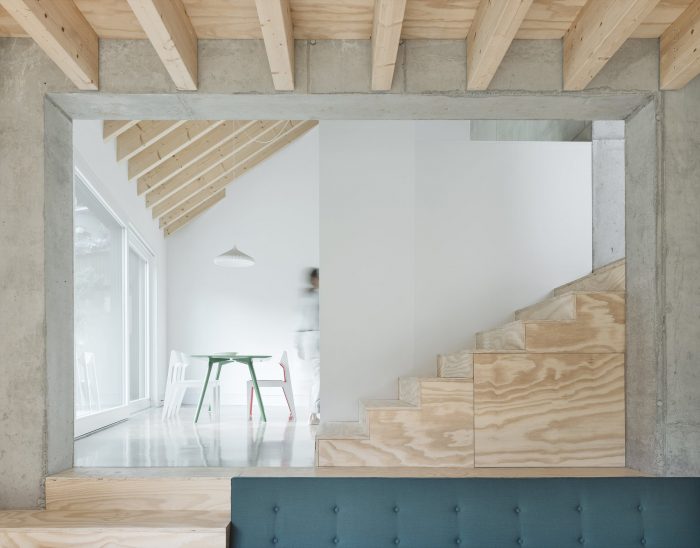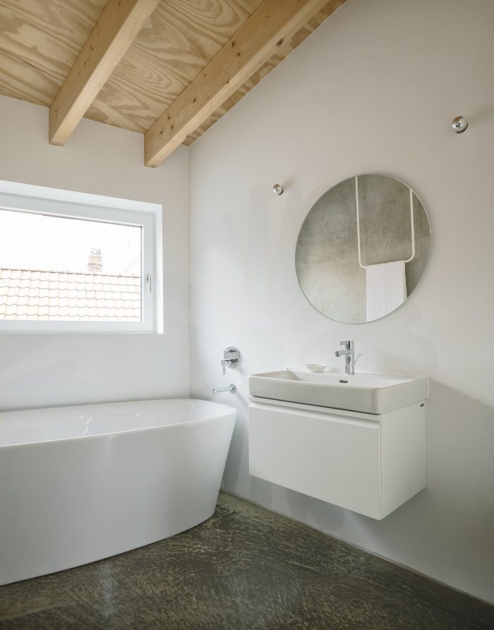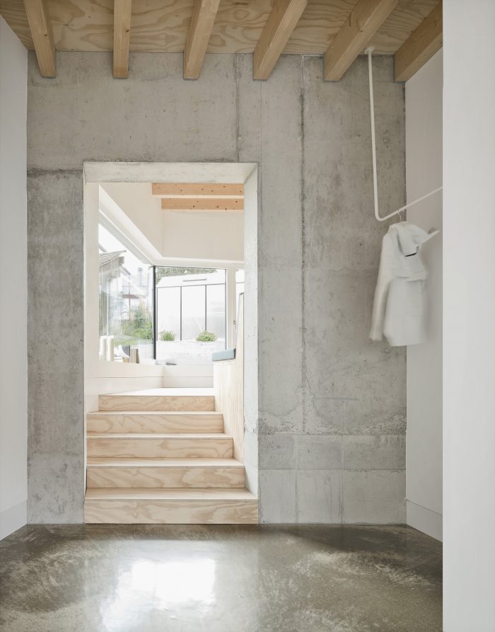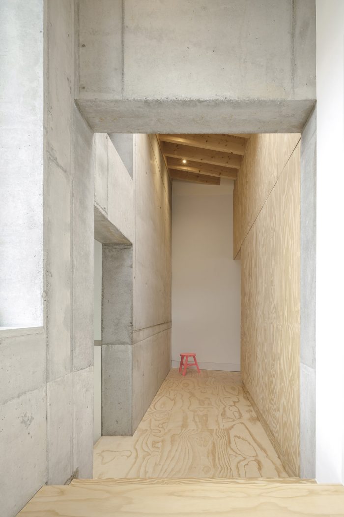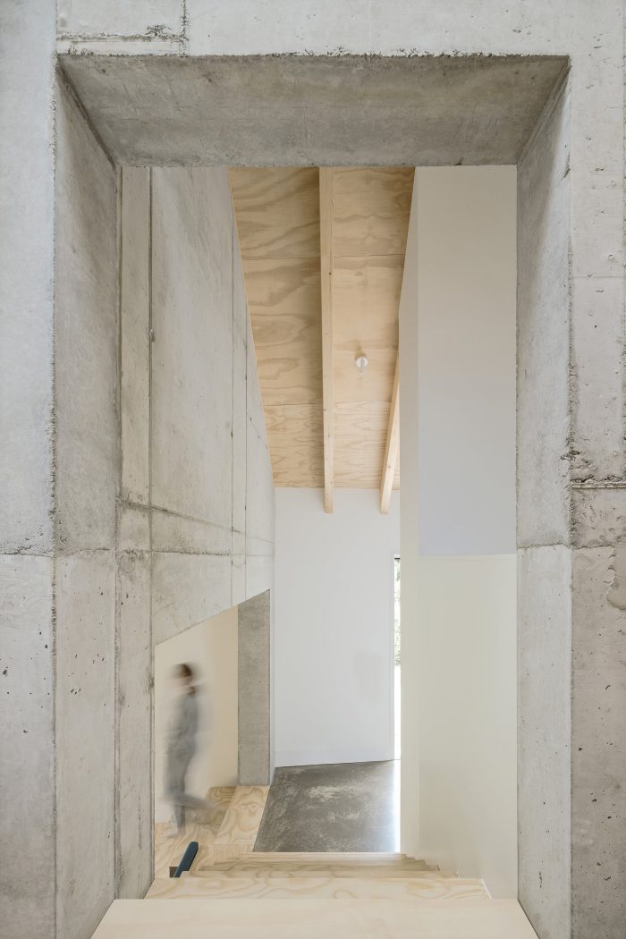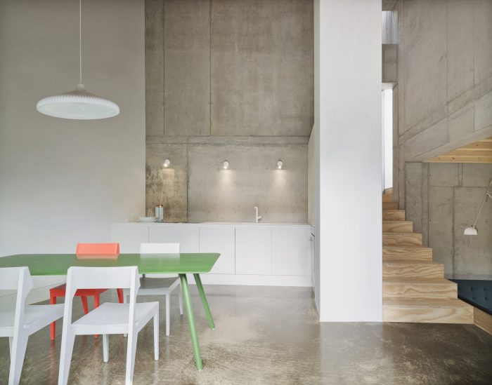 The arrangement of the respective rooms promotes cohesive und continuous interactions between each floor, creating a unique feeling of space and surprising occupants with ever- changing viewpoints and angles. Quiet retreats and unconstrained common spaces can be used simultaneously and are created effortlessly. The relation between these rooms is staged deliberately, in tune with the routine of their inhabitants. The rising sun lights the bedroom in the morning. The living area is located on the house’s sunny south side, and in the evening, cooking and dining will take place accompanied by the sight of the setting sun.
