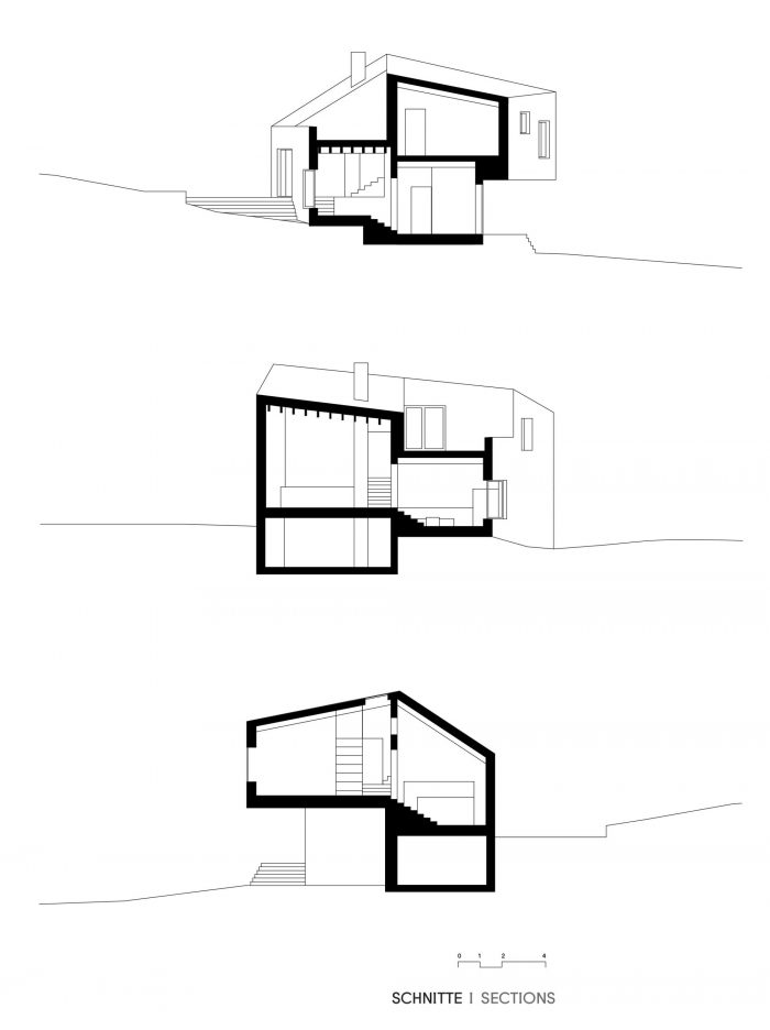 "Haus D "占据了图特林根市郊区一个风景优美的中心地带的一小块土地。它被紧紧地夹在过去几个世纪建造的传统建筑之间,乍一看,这个地方似乎根本不适合建造新的建筑。然而,Haus D矗立在这里,其结构根据太阳的位置进行调整,其形状由相邻的建筑和它们之间的距离决定。从东到西,Haus D的地面高度相差三米。这种地形条件推动了项目的概念设计。在其东侧,Haus D有两个内部楼层,一个前院和一个外部驱动器。在西侧,它容纳了一个内部故事和一个带有外部花园的后院。