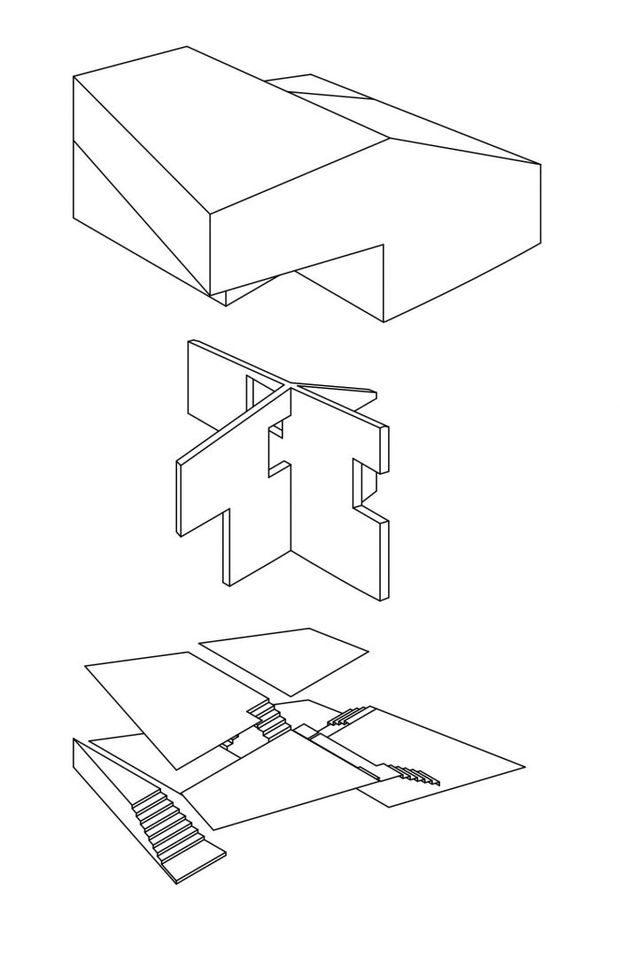The house’s interior also responds to the site’s conditions. Two upright concrete slabs, arranged in the form of a cross, divide the living area into four segments. The rooms spiral around this structure, clockwise from bottom to top. This feature allows a literal round trip through the house. From an exalted concrete platform in the entrance area, one processes to the living room, to the dining room, to the master bedroom on the 2nd floor, and finally to a roof terrace, which offers breathtaking views southwest over the city.