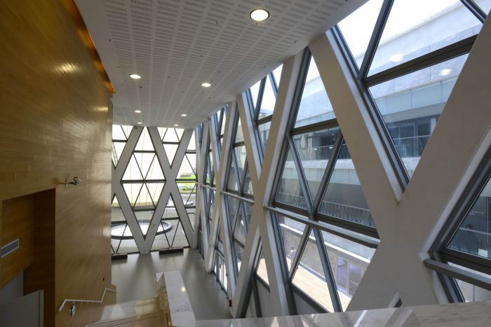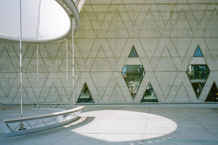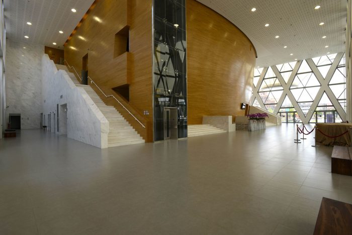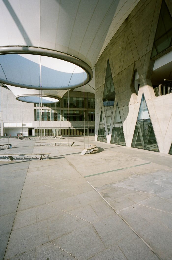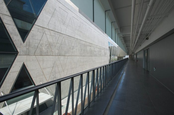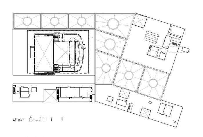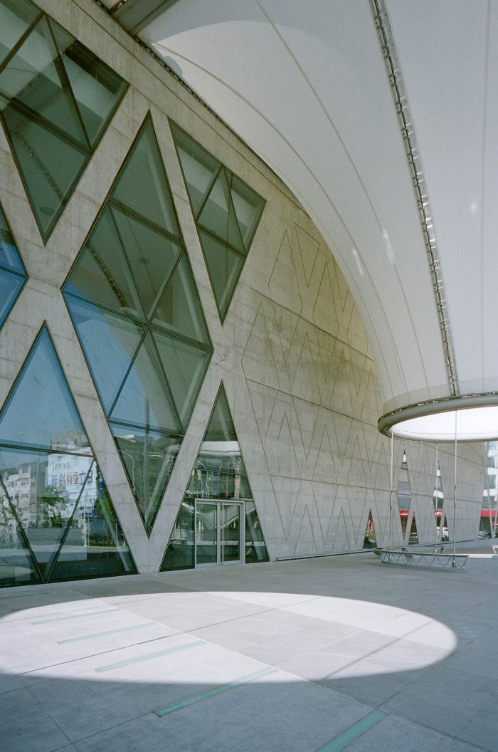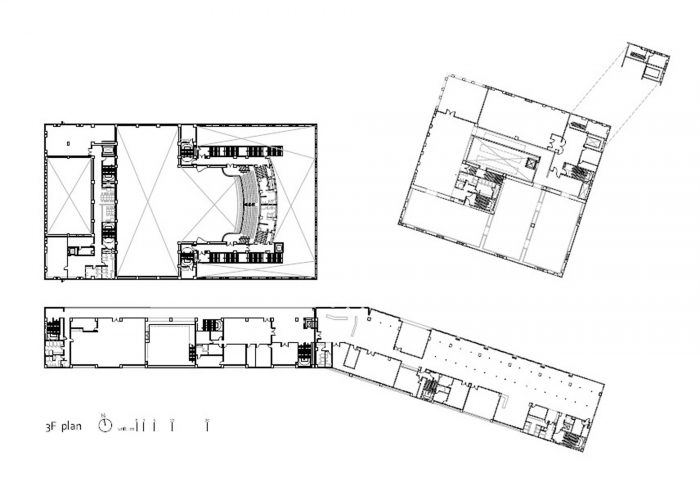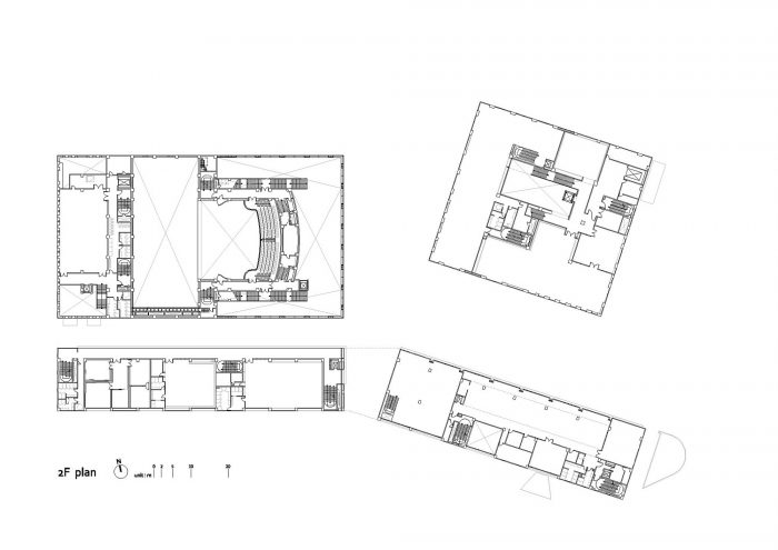 A 900-seat theater and a small rehearsal hall, cladded in wood and perforated metal, are center pieces of the program. The theater is designed as a wood volume contained inside the X-shaped concrete facade. The facade of the whole project is homogenous, yet implies the program inside by subtle changes in density.