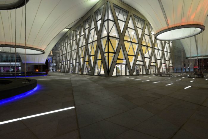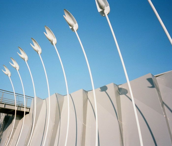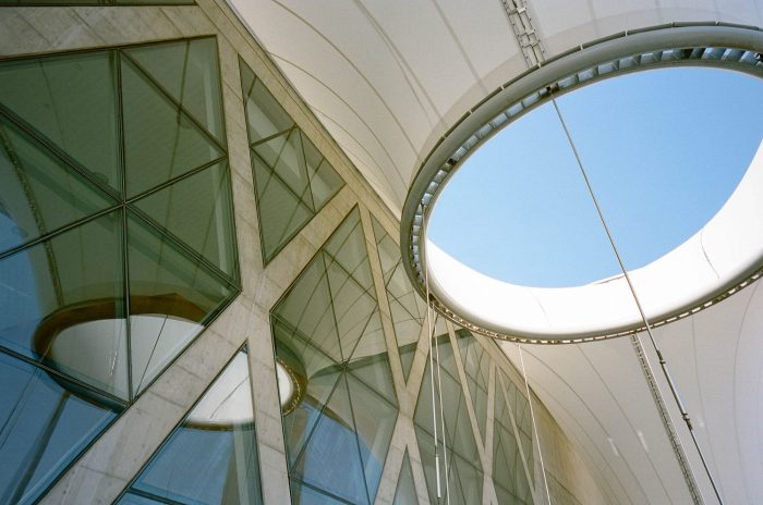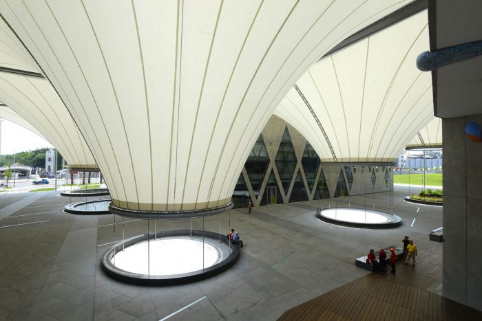 舞蹈、太极拳和各种游戏等活动对公共空间的密集使用是台湾城市户外使用的特点。薄膜屋顶为广泛的活动创造了一个遮阳条件。屋顶的形状可以防止极端的气候条件,如台风、定期的强降雨和夏季高温。屋顶上的宽孔将水引导到内部泉眼。温暖的空气上升到屋顶顶部的开口处,产生新鲜的内部气流。