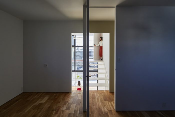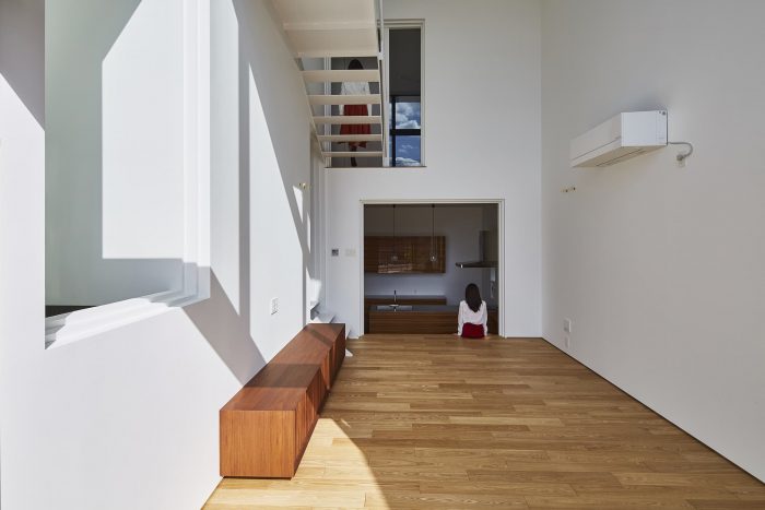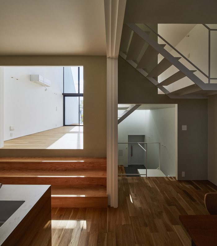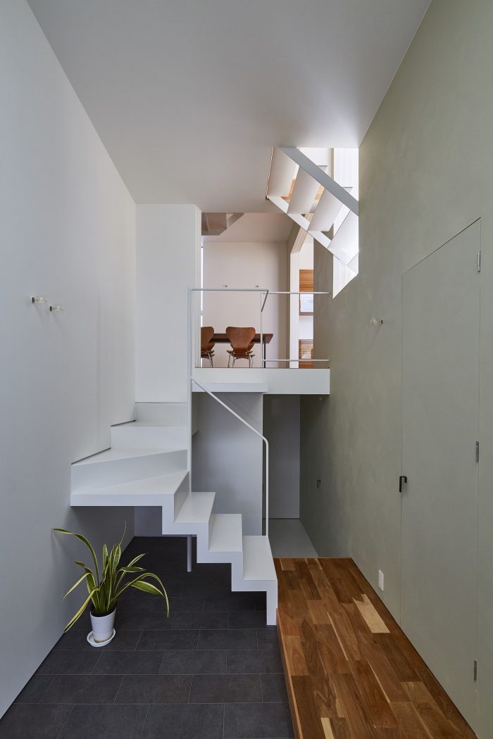 By the wall with the shape of 田 have been existed white color side and gray color side, the sunlight from big opening could have gradation more strongly and it could have been felt walking up spiral split-level house.