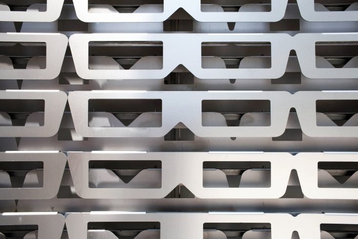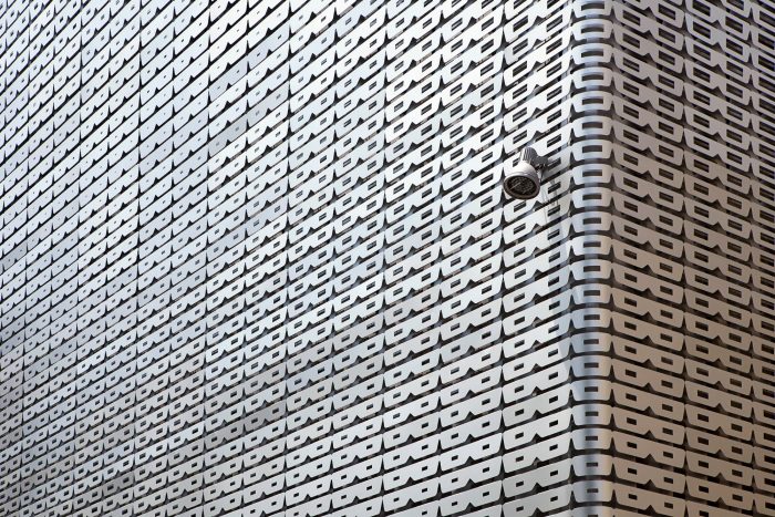 决定外部形象的带玻璃图案的面板由内部和外部面板组成,它们交替放置。与不同大小的开口的面板相结合,使覆盖物具有丰富的立面纹理和深入的敏感性。各种光束的流动使其表面看起来略有不同。为了提高审美效果,在2毫米的铝材上要涂上阳极氧化涂层。
