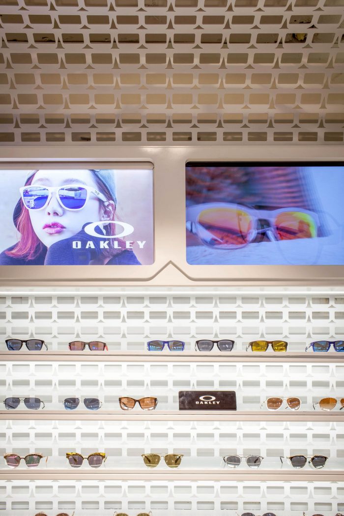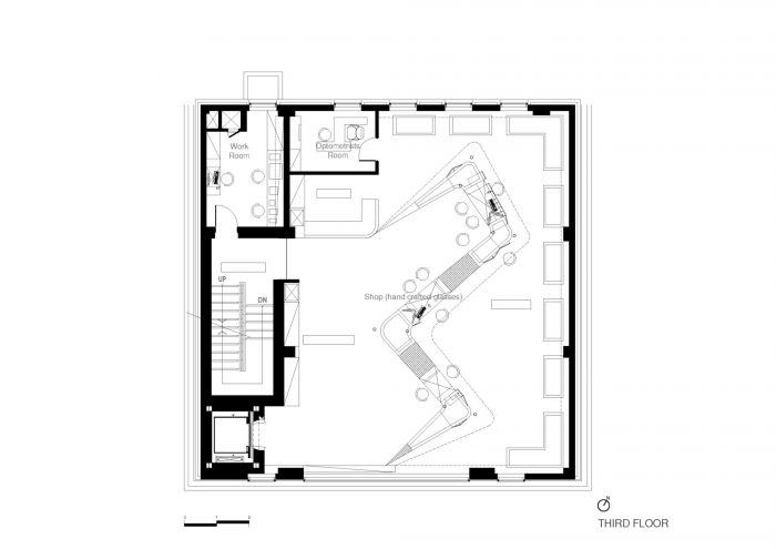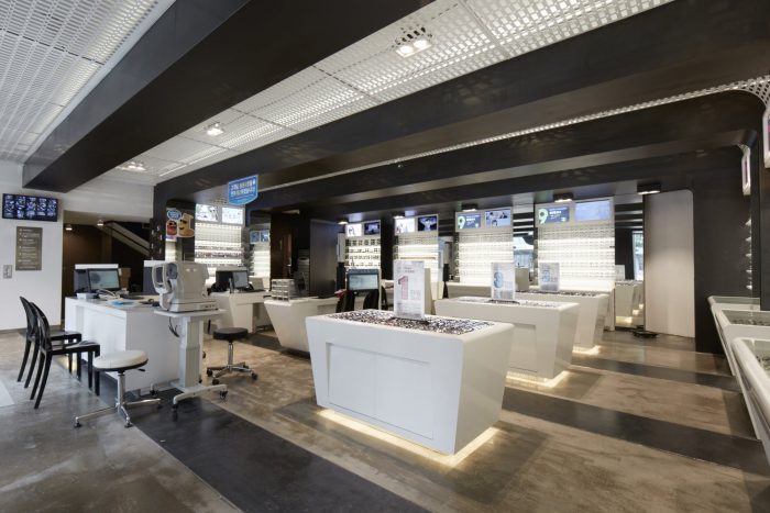 For interior finish, we intended to form the façade with the glasses pattern, same as the motive of glasses pattern on the outside. In other words, the Galvalume panels which become the motive of glasses form the main façade of the interior space which displays glasses. Such laser cut façade and black iron plate create a linear feeling for major space. Also for floors, epoxy lining is applied over concrete and mortar, intended for materials used to mingle with each other. We have selected the furniture with a unique streamlined design, representing the interior space. The show room across the interior space is furnished with consultation tables and vision measuring machines, etc.