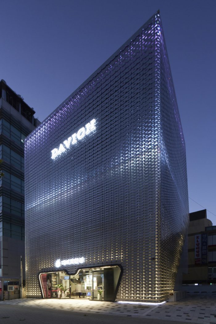 The façade is to be constructed in order of panels for waterproof and lighting, inner panels, and outer panels. One of difficult parts especially in configuration of this façade was to set a space for lighting installation and maintenance. The wall grazer light which shines the back panel is an important device that projects light onto the back side of glasses and lets a certain patterned image come out between gaps of glasses. This shines a wide variety of light sensitivity at the rear-end panel according to the LED dimming function. Furthermore, it is designed to change images in different colors according to color variations of RGB programmed. During the daytime, it helps stay true to the feeling of aluminum (raw material), and at night create various images of outer pattern in accordance with the certain LED program.