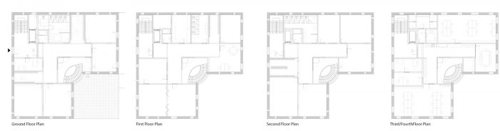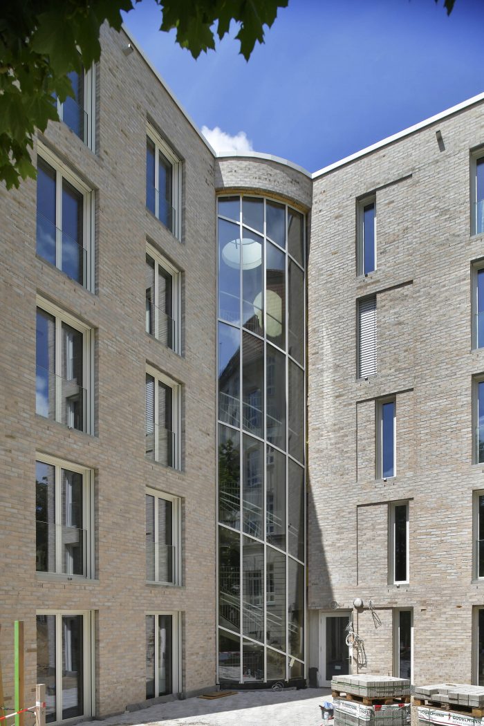 历史上的角楼的体积和它的典型平面图决定了新的结构。它的外墙采用了现有建筑的网格和比例,并以一种有趣的方式重新解释了它们。外墙的材料以经典的石膏外墙为基础,将其转化为轻度灌浆的裸露砖石外墙,显示出其在整个建筑群中的独立元素。