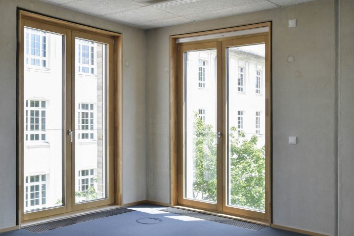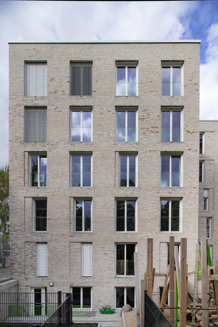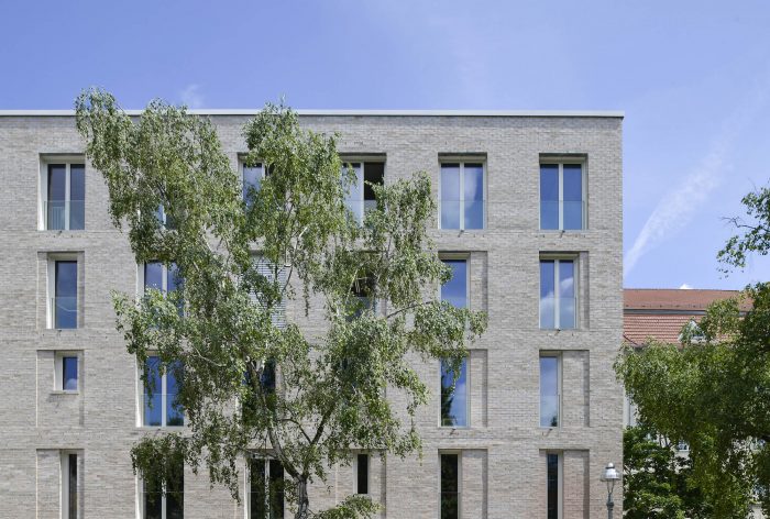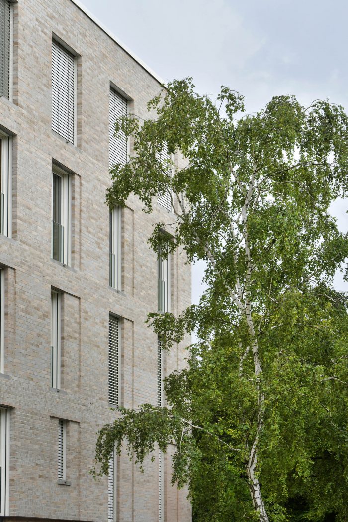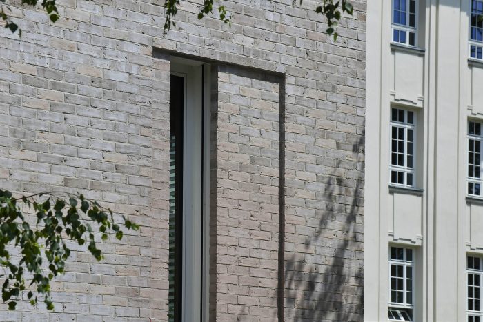 The volume of the historic corner house and its typical floor plan determine the new structure. Its facade adopts the grid and proportions of the existing building and reinterprets them in a playful way. The material of the facade is based on the classic plaster facade, translating it into a lightly grouted exposed masonry facade, which shows itself as an independent element in the ensemble.