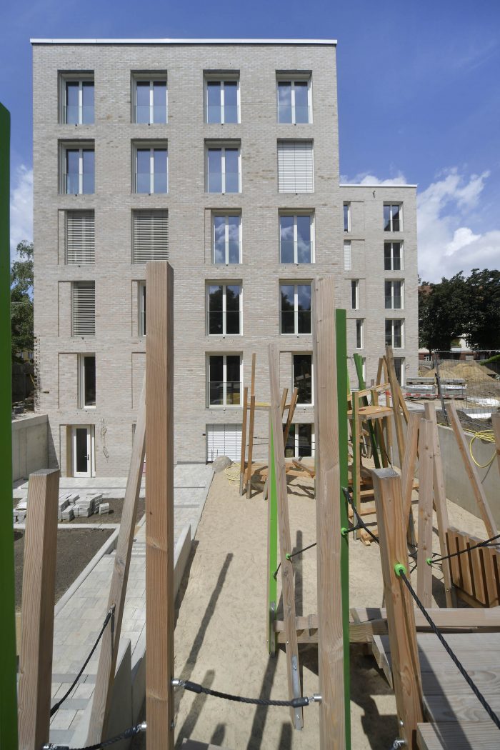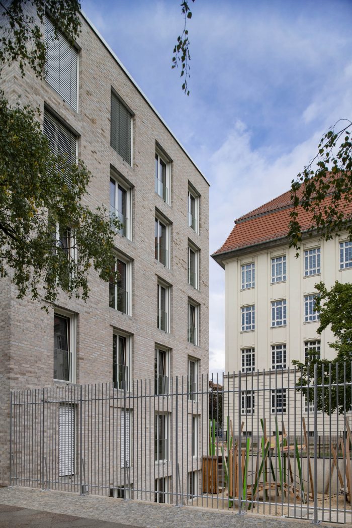 This was preceded by a long discussion about the where and how of the daycare center, to which the coworking areas for the BHT were added in the further process. After a long search for a suitable building site for the daycare center on the BHT site, the location at Haus Beuth, a former school planned by L. Hoffmann in 1908-10, was selected as the only possible location. The new building had to fit into this monument ensemble, which consists of the main building and two corner houses, one of which was destroyed in the war. The dialogue between the existing ensemble and the new building characterizes its architecture.